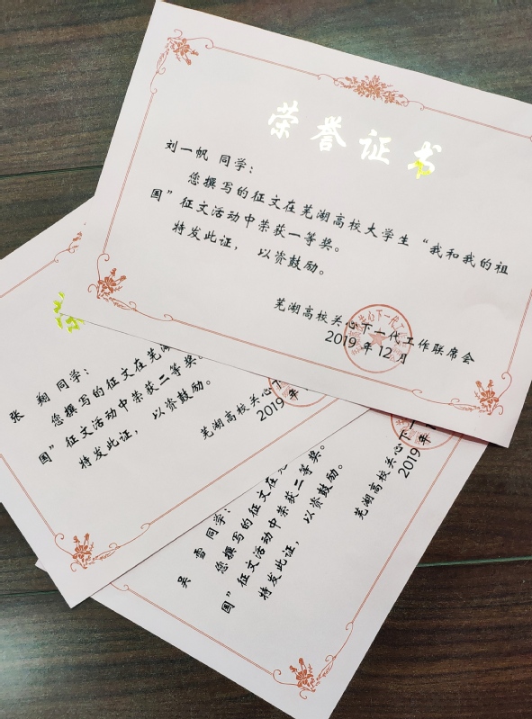 本网讯 12月26日,芜湖市“我和我的祖国”征文评选结果揭晓。我校关工委、工会、团委选送的3件作品分别获得一等奖、二等奖。其中,环境工程183班刘一帆同学的《当粉笔用完,那就换一根继续》获得一等奖,自动化183班吴雪的《我和我的祖国》、动画181班张翔的《祖国就在身边》获得二等奖。