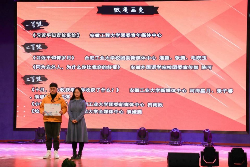 本网讯 12月28日,第三届安徽校媒精英汇——安徽校媒•高校新媒体巡展颁奖暨工作交流会在合肥举行。在本届精英汇上,安徽工程大学官方微信公众号获得“十佳微信公众号”锐意进取奖。校团委青年传媒中心的作品《习近平知青故事绘》获新媒体作品微漫画类一等奖。