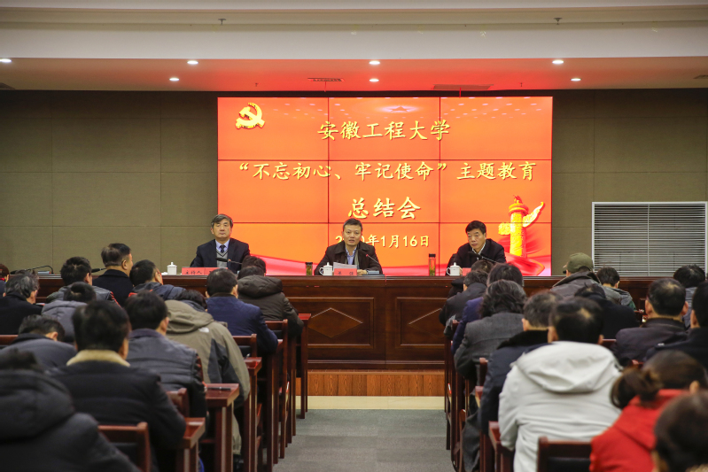 本网讯 1月16日,安徽工程大学在图书综合楼202会议室召开“不忘初心、牢记使命”主题教育工作总结大会,学习贯彻落实习近平总书记重要讲话精神,全面总结学校主题教育工作,对巩固扩大主题教育成果进行部署。省委第十巡回指导组副组长,团省委副书记、党组成员单强等一行3人到会指导,单强讲话。校党委书记刘宁作主题教育总结报告。校党委副书记、校长王绍武主持会议。