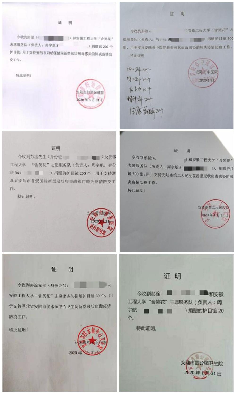 “含笑花”志愿服务团队同学们在搜索分析海量援助方法与渠道信息的基础上,与湖北一线医疗人员取得联系并在1月25日发起了“驰援湖北 公益募捐”行动。他们借助互联网在微信朋友圈、QQ空间,向广大师生与社会人士介绍一线疫情及物资急需情况,发起公益募捐并建立专题网页和“进度公示群”,便于参与募捐者及时跟进到善款使用情况、物资输送情况。截止2月1日10:00,募捐总额达到45505.94元,参与募捐人数2521余人。团队分别向湖北省安陆市普爱医院、安陆市第二人民医院、安陆市中医院、安陆市妇幼保健院、安陆市李店镇卫生院、孝昌县妇幼保健院共捐赠1000个医用护目镜、730只医用口罩、300套医用防护服、200支乙醇消毒液、20瓶免洗手消毒液。同时,他们还协助校医院收集国家批准的正规医疗物资生产厂家、销售商供货信息或防控物资。