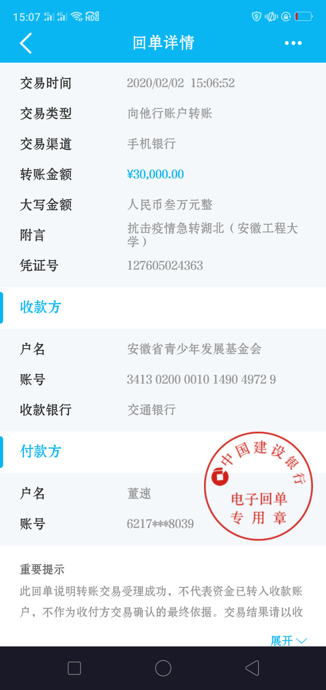 校青年启航社、“雪滴花”志愿服务团队积极响应安徽省青少年发展基金会《抗击疫情,希望同行——安徽希望工程特别行动》号召,面向校内外发起募捐活动,捐赠资金以学校名义统一捐至安徽省青少年发展基金会等,助力湖北和安徽疫情防控工作。截止2月2日22:00,团队累计募捐金额37805.11元、捐款参与700多人次。团队向安徽省青少年发展基金会捐出第一笔资金30000元,用于支援湖北抗击疫情。