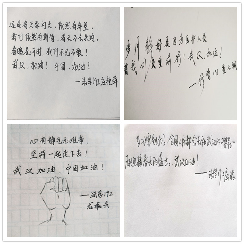 在社区里,人文学子用自己的平凡奉献书写着不平凡的战“疫”故事;在文字中,人文学子则用祝福助力着这场没有硝烟的战争。他们一笔一划地写下对医护人员的深切鼓励,和对祖国美好明天的诚挚祈愿。“武汉加油,中国加油!”一字一句,铿锵有力,落地有声。