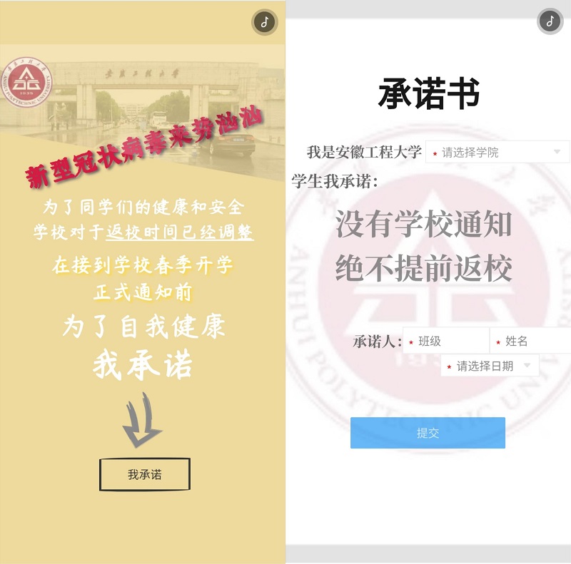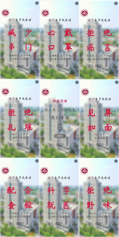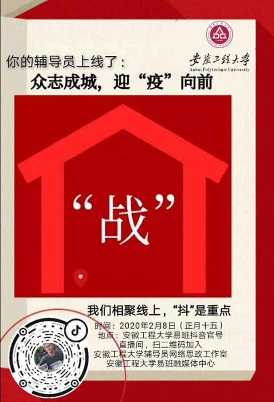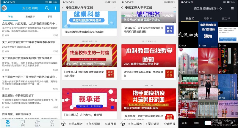整合资源,教育引导,为学生穿上思想“防护服”。为落实学校疫情防控工作要求,扎实做好疫情防控期间学生的教育管理服务工作;学生处依托“易班”中心新媒体矩阵,充分发挥网络平台优势,通过学工官方网站、学工微信、“易班”APP、易班官方抖音发布《致全校学生的一封信》《携手防疫抗疫 共筑美好家园——安徽工程大学致全体师生员工、学生家长、广大校友的一封信》《让党旗在疫情防控斗争第一线高高飘扬》等各类宣传文章16篇;转发《预防新型冠状病毒感染知识》等科普内容5篇;发布《关于加强学校疫情防控期间校门管控的通知》等各类校园各类通知6篇;制作防疫原创抖音视频4条;制作“防控疫情从我做起安工程人承诺书”和“为了自身安全不提前返校承诺”等H5内容在学生朋友圈广泛传播,截至发稿所有作品累计阅读量近80000人次。同时我校“易班”中心还联络省内外20多所高校,共同在“易班”APP发起“防疫知识竞赛”活动,联合校团委积极开展“宅在家中”“携手防疫抗疫、共建美好家园”网络主题团日活动等。教育学生正确认识、科学理性应对疫情,引导学生服从防控大局、服从学校管理,倡议学生合理安排假期、做好学习规划;引导学生做好自我防护,不提前返校。