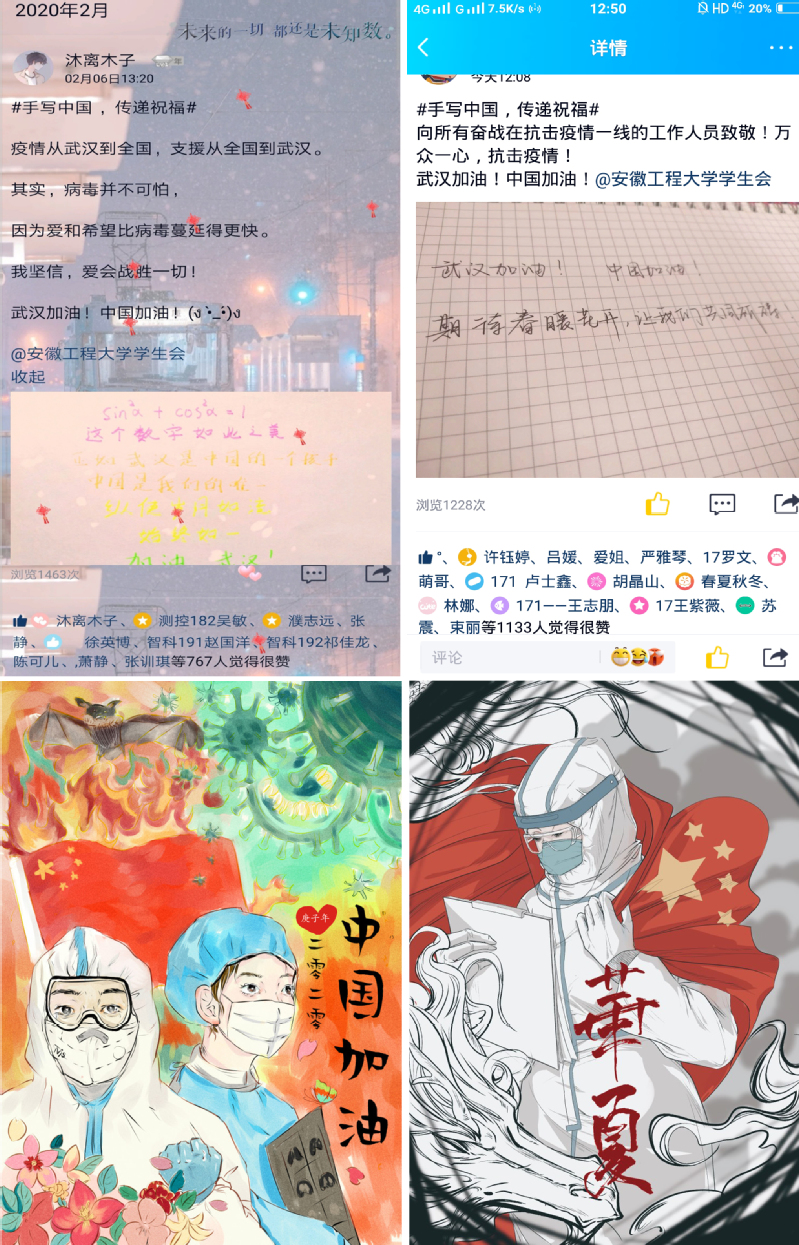 2月5日,校团委、校学生会发起了“心愿+我为疫区送祝福”活动,受到师生广泛关注,校园网阅读量超过1.6万次。全校800余名同学通过网络提交了“手书中国”“海报宣传”“音动中国”3个类别的原创作品。“手(守)绘疫情”“武汉加油”“中国必胜”“战(疫)必胜”“方言祝福音频”等内容,全面展现广大同学对疫情的关注、对疫区的关心。其中,“手书中国”类别作品以自媒体平台集赞方式进行,作品累计浏览量50000+,点赞量20000+。电气工程学院自动化191班纪慧瑶同学写道:“我们众志成城,一起等待春暖花开,等疫情过去,我们一起去武汉看樱花。哪有什么岁月静好,只不过有人为你负重前行。”机械与汽车工程学院智能与科学191班李恩成同学写下:“sin2a+cos2a=1,这个数字如此之美,加油武汉,加油中国。”在这场战“疫”中,很多大学生快速成长,他们更懂得珍惜,并以实际行动当好生命教育“宣传员”。