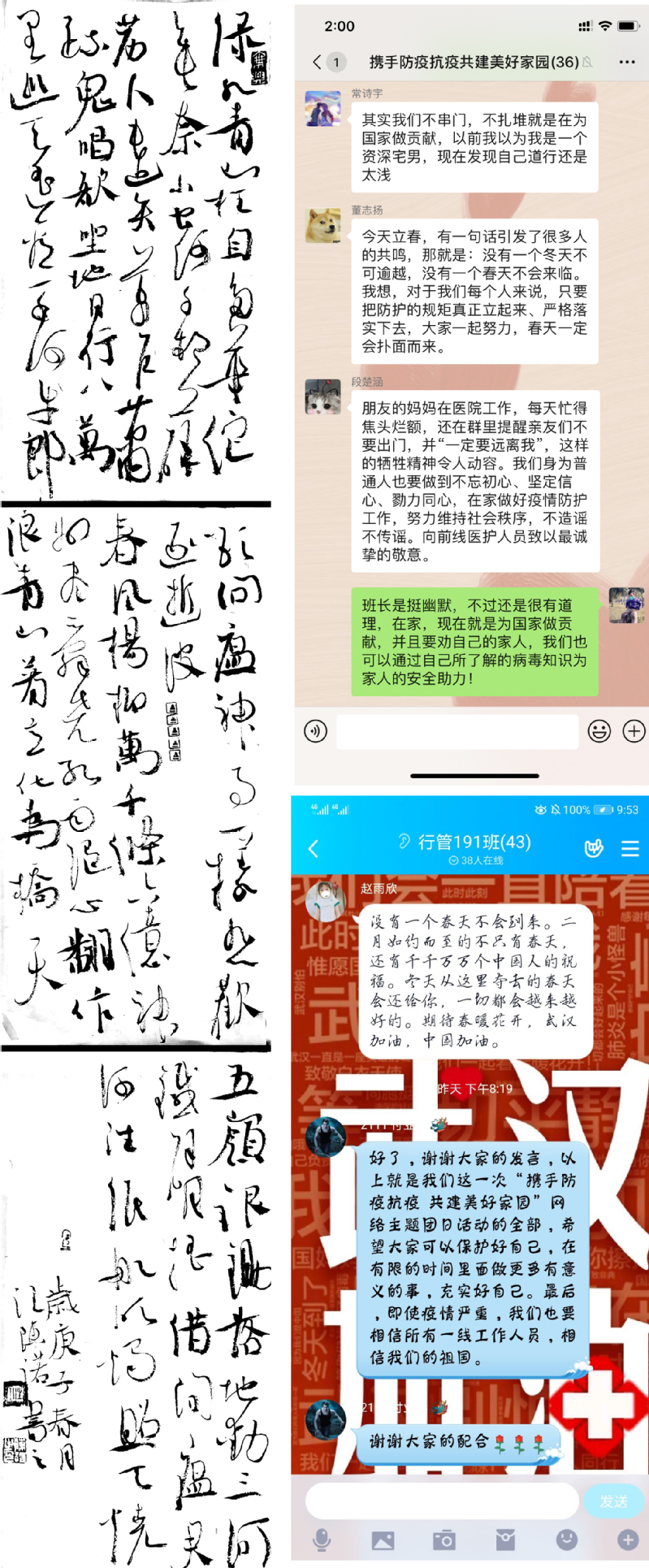 2月4日,学校共青团组织部署“携手防疫抗疫 共建美好家园”网络主题团日活动。全校各班级团支部、社团团支部迅速行动,结合学院专业班级特点和个人兴趣特长,开展“线上专题学习、线上专题交流、线上创新创作”等活动,各学院团委、团联会通过微信公众号集中展示各班级(社团)团支部主题团日活动情况。截至目前,共计400多个团支部16000余名团员青年参与网络主题团日活动。纺织服装学院纺织182班团支部以寝室为单位开展疫情防控知识线上答题并自发组织捐款。数理学院金融191班团支部成员分别录制祝福视频并进行线上分享。体育学院表演191班团支部居家排练手势舞并剪辑成视频,集体表达对武汉的祝福。书法协会、手绘协会、爱乐社、扬帆文学社、子衿诗社等社团团支部组织创作了书法绘画、音乐、诗文等主题文艺作品。形式多样的网络主题团日活动,让团员青年“宅在家里”更充实更有意义,推进了青年大学生深入学习领会习近平总书记关于疫情防控工作的重要讲话精神,上级党团组织的部署安排,以及学校党政关于我校疫情防控工作的具体要求。
