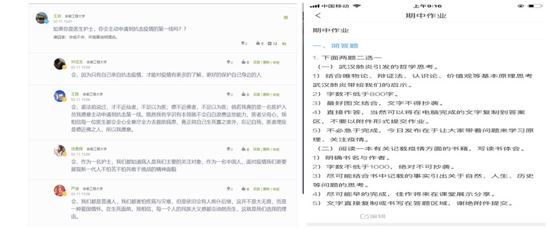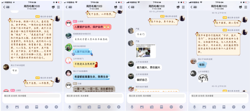 线上教学中,教师们将防疫抗疫中涌现出的先进人物、典型事迹作为教学案例和鲜活素材融入教学,厚植爱国主义情怀,教育引导学生遵守规则、热爱生命。王效老师在开学第一课利用“如果你是医生护士,你会主动申请抗击疫情的第一线吗?”的话题,引导学生通过角色转换,表达对抗战在疫情第一线的医护人员的崇高敬意;毛加兴老师充分挖掘疫情与原理课程的结合点,引导学生关注疫情,思考疫情背后的哲理;彭鸿雁老师组织“战‘役’,我们在一起”专题教学,引导学生们思考关于生命、关于敬畏、关于担当、关于理性……教育学生担当起时代赋予的使命与责任,为打赢疫情防控阻击战作出自己的贡献。