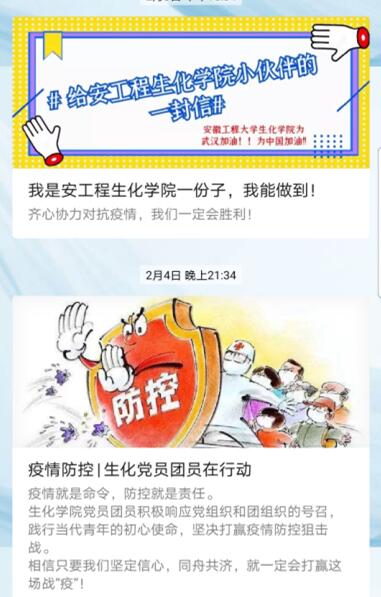 守土有责,筑牢思想政治高地。加强党团小组关于新冠肺炎疫情防控专题理论学习,认真学习领会上级文件精神以及学校疫情防控的相关工作要求,正确引导学生客观理性地认识新型冠状病毒的病状、传播途径、预防措施等科学知识;以学院团委公众号为平台,及时转发校内外官方媒体公布的疫情报道,引导同学们关注疫情,了解新型冠状病毒防护知识,鼓励同学们带头成为防控知识的传播者、疫情谣言的制止者、健康校园的守护者;与学生进行线上交流沟通,将爱国主义思想、珍爱生命观、社会责任感、无私奉献精神等教育贯穿其中,用钟南山院士、李兰娟院士等“逆行”至抗疫一线的鲜活事例感染学生,让他们时刻都能感受到祖国的强大,感动于一线医务工作者的责任与担当;组织线上倡议活动,如“防疫保卫战,我们一定赢!”“我是安工程生化学院一份子,我能做到!”“疫情防控,生化党员团员在行动!”,倡议全体同学坚定信心、同心同向、众志成城,坚决打赢这场疫情防控阻击战。