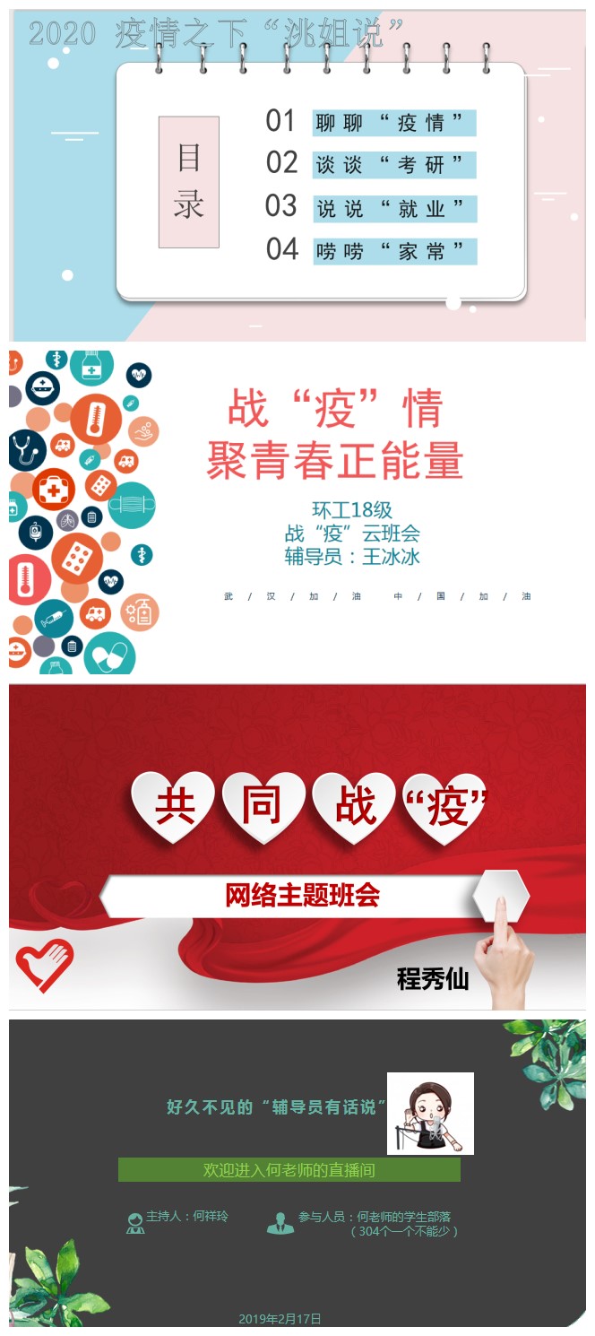 守土尽责,践行使命与担当。生化学院9名辅导员于2月17日至2月19日通过多种途径开展了网络主题班会,宣传疫情基本情况,开展学生思想教育工作。在主题班会过程中积极传播正向能量,时刻传达出战胜疫情的坚定信念,并把这股必胜的信心传达给每一位学生,让每一位学生都坚信党和国家有决心、有能力带领全国人民打赢这场疫情防卫战;以疫情为契机,在和学生沟通交流时厚植学生爱国情怀,磨炼学生坚强意志,强化学生政治担当,从而让学生真切感受到思想政治教育的时代感召力和影响力;主动与学生分享辅导员自己对这场抗“疫”阻击战的思考与感受,展现自身作为思政工作者的责任担当与政治担当;了解学生参与志愿服务的情况,肯定其志愿服务精神,同时叮嘱其注意个人防护,提醒不要耽误在线学习。