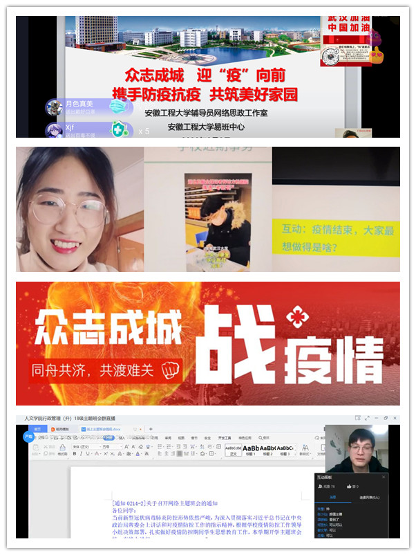 积极开展心理辅导。辅导员利用自己的专业知识,积极作为,给予学生关心与支持。引导学生阅读学校编印的《安徽工程大学新型冠状病毒心理防疫手册》,宣传疫情心理自助与疏导的知识,帮助大家培养抗击疫情的良好心理状态,共同度过这一艰难时期。生化学院主动关心关爱家庭经济困难学生、学业困难学生和受疫情影响的学生,做好关怀和疏导;艺术学院学子录制“武汉加油”祝福视频,坚定青年学生理想信念,激发爱国情怀的内生动力,为疫情防控注入“心”力量,目前视频在各大平台播放量突破5万次。