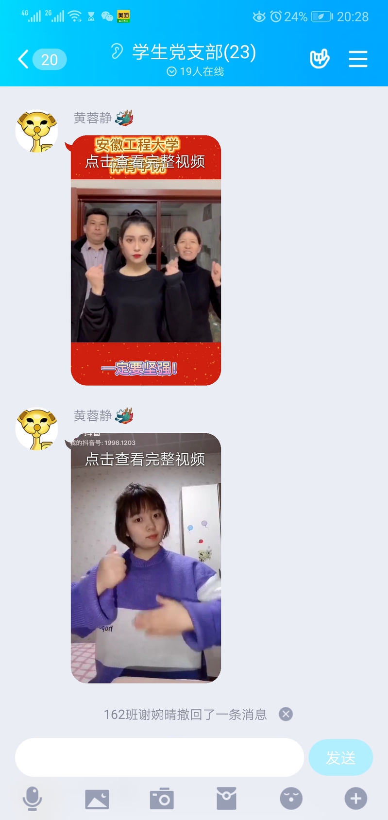 坚持学习,文化防疫。在学生党支部书记黄蓉静的带领下,学生党员在《学习强国》App上进行每日打卡学习、崇尚学习、加强学习,紧跟党中央步伐,深入理解学习习近平总书记重要思想;黄老师通过网络直播中向同学们介绍国家级非物质文化遗产——安徽凤阳花鼓,弘扬中华优秀传统文化,鼓励大家利用假期延长的时间,学做更加有意义的事情;支部同学加强抗击疫情的知识学习,在疫情面前,抚慰家人和朋友,做到不恐慌,不害怕。