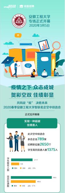 疫情防控期间,就业创业指导中心在举办安徽省工科(芜湖)网络招聘会的同时,主动对接各类线上招聘平台,开展新安人才网、智联招聘网、易校招等4场“空中双选会”,2346家企业通过审核参会,提供职位数10728个,投递简历数达6800余份;各学院发动教职工,主动利用各种资源和渠道,联系优质对口企业并了解企业用工需求,按照学校就业工作考核要求,举办了机械类、电气类、建工类、艺术类、计算机类等行业性“空中双选会”,当前就业创业指导中心正在联系线上招聘平台,计划开展金融人文外语类“空中双选会”,实现双选会行业全覆盖;主动与地方人力资源社会保障部门联系,共享招聘资源,发布了合肥、芜湖、南京、苏州、杭州、嘉兴等15地市线上招聘信息;学校已全面推行毕业生网签系统,用人单位网上发布信息,网上宣讲,毕业生网上投递简历,网上面试,供需双方达成协议后网络签约,保障学生网上求职无障碍。