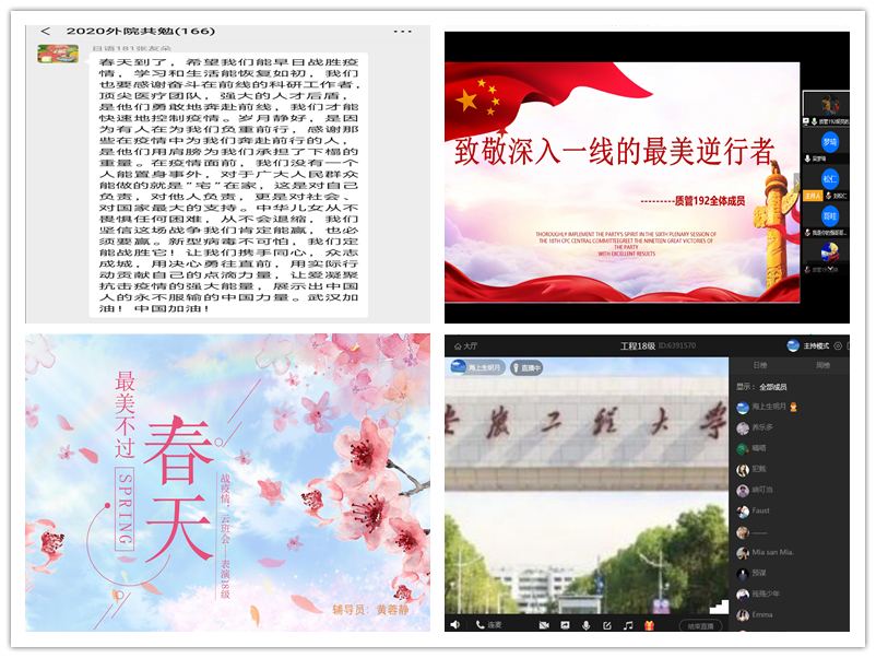 讲好故事、爱国力行。辅导员通过讲故事的形式展示了抗击疫情期间难以忘怀的坚守、携手并进的奋战、守望相助的关爱和万众一心的感动,坚定同学们爱国力行的使命责任。管理学院辅导员凝聚爱国主义教育“硬核”力量,视频在线分享疫情防控一线中涌现出的先进典型故事,在线开展“向英雄致敬,向祖国告白”主题教育活动;外国语学院辅导员通过分享故事,鼓励同学们将时间和精力放在学习上,合理利用网络开展线上学习工作,真正做到“停课不停学”,用最积极的态度充实自己;计算机学院和人文学院辅导员鼓励学生利用多种网络课堂,补牢专业知识,提升就业能力,在以后的生活工作中要有民族大义和社会担当,扎根人民、奉献国家。