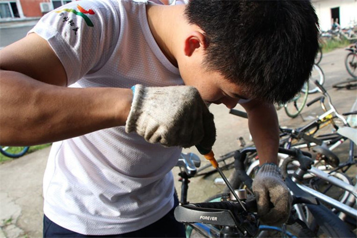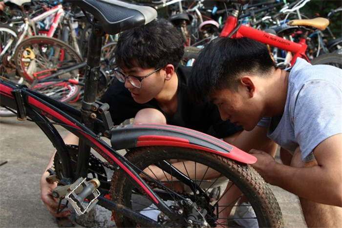我校材料科学与工程学院团委书记陶冶为我们揭开了答案,原来这些崭新的公益自行车的前身就是校园里一辆辆废弃无主的自行车,它们既影响校园美观,又妨碍校园交通,成为了校园“痛点”。“含笑花”志愿服务团队发挥机械工程学院、材料科学与工程学院相关学科优势,依托自行车拆装大赛,对校园内废弃无主自行车进行重新组装改造、粉饰出新,从而变成崭新爱心公益自行车。