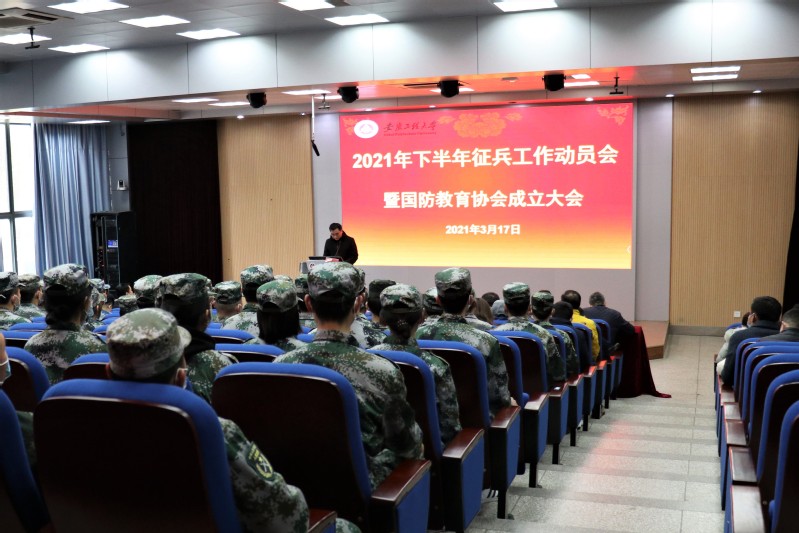 本网讯 3月17日,学校在5J117召开2021年下半年征兵工作动员会暨国防教育协会成立大会。校党委常委、副校长郑健,芜湖市退役军人事务局党组书记、局长李达志,芜湖市鸠江区人民武装部部长时本庆,校征兵工作领导小组成员单位负责同志、各学院征兵工作联络员、国防教育协会成员、国旗班学生参加会议。会议由校武装部部长文才新主持。