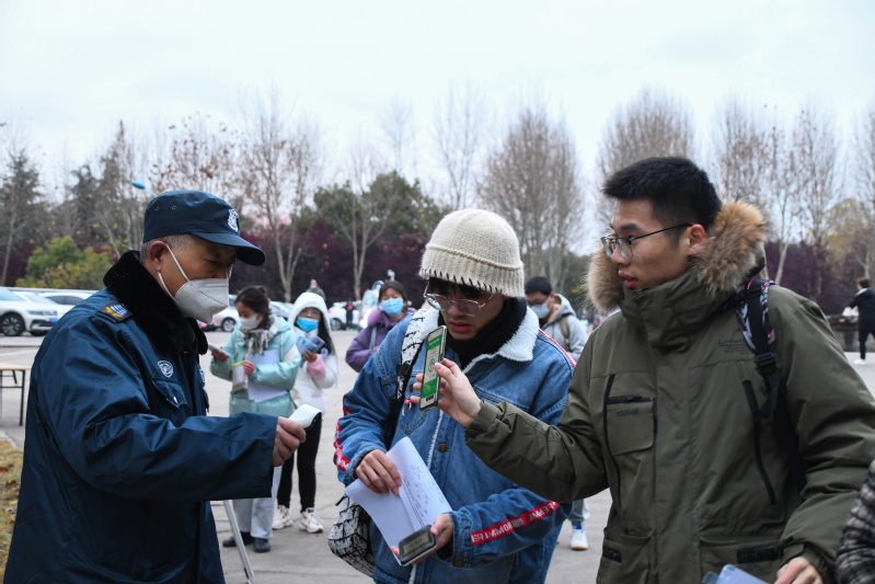 在做好疫情防控的同时,以学生为本,提供暖心服务。安排校医院医护人员及时提供救治和护理,邀请医护人员进校为考生和工作人员统一做核酸检测,租用23辆大巴车为国际工程师校区1000余名考生送考并开放师生活动中心供其中午休息,为考生提供备用文具,组织志愿者提供应急服务等。高分子181班的考生柯达同学,因打篮球受伤而导致腿脚不便利,而室友也都是考研大军,所以只能只身拄拐赴考。保卫处工作人员看到后第一时间为他提供了爱心候场板凳、全程护送他到达5楼的考场,考场监考教师为其提供细心周到的服务。他表示:“天很冷,老师们的举动让我觉得很温暖,十分感谢学校和老师为各位考研学子提供了很多帮助!希望大家都能考出好成绩,一起‘上岸’!”
