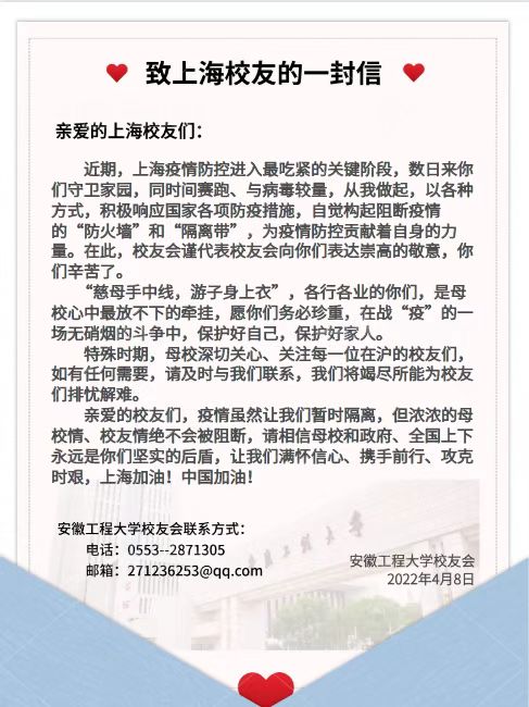 本网讯 近期新冠病毒奥密克戎变异株引发的疫情突袭申城,上海人民面临着疫情常态化防控以来最严峻的考验,他们在风雨中鏖战坚守、守望相助,全国各地驰援上海、共同守“沪”。上海的疫情牵动着我校师生的心,学校校友会对上海校友更是十分挂念,发出《致上海校友一封信》,表达了母校对校友深切的关怀与关心,鼓励大家增强信心,共抗疫情,表示母校是他们在困难时期的坚强后盾,希望“家信”能给各位校友带去问候与力量。