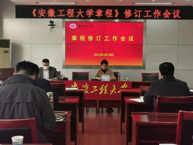 本网讯 为深入贯彻落实习近平总书记关于高等教育系列重要讲话精神,进一步推进我校依法治校、依法办学,高标准、高质量完成《安徽工程大学章程》(以下简称《章程》)修订工作,4月18日下午,学校在行政楼1121会议室召开专题会议,就章程修订工作进行安排部署。校党委副书记苏国红主持会议,学校各职能部门负责人参加会议。