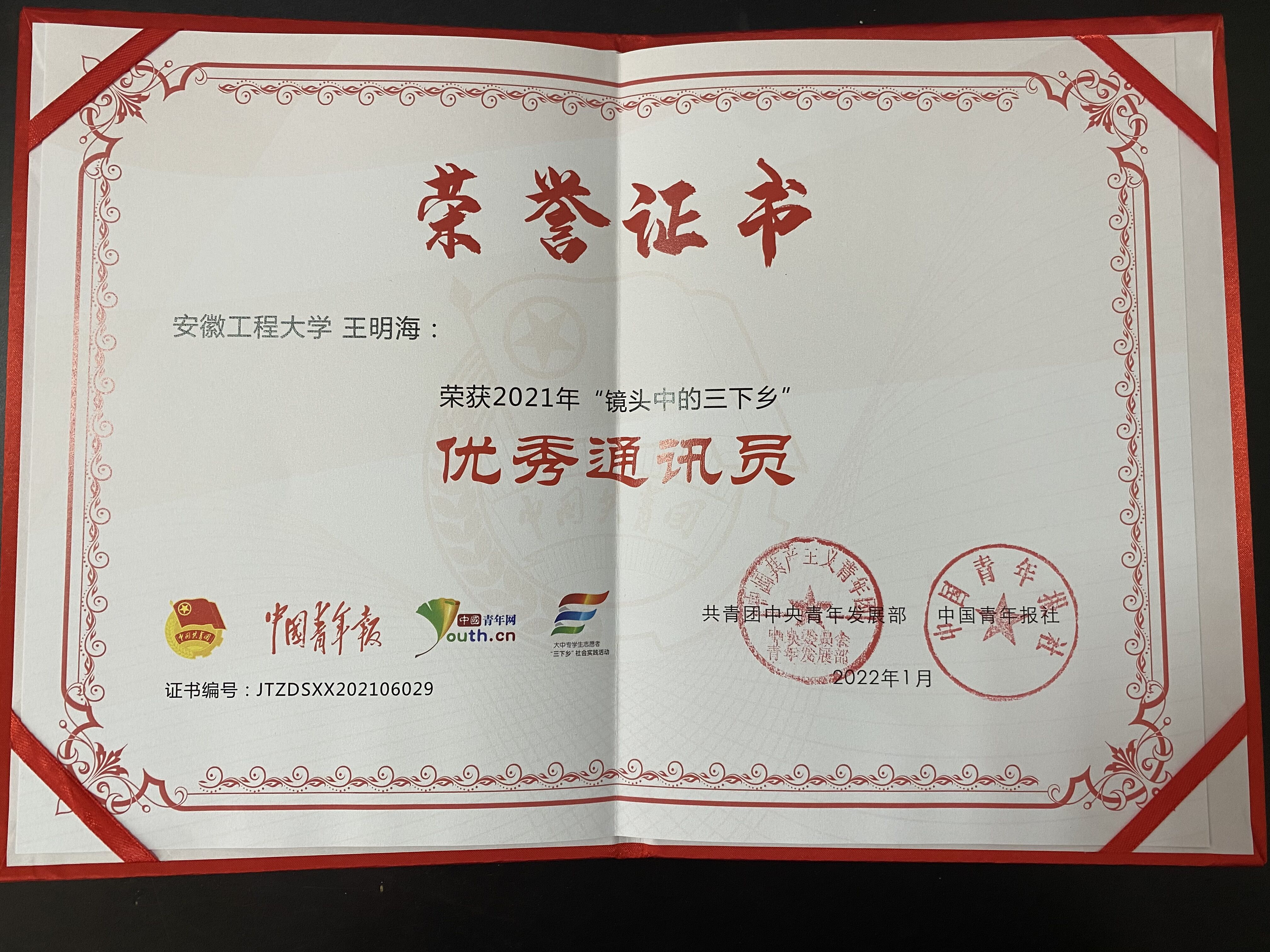 本网讯 近日,中国青年网公布关于“镜头中的三下乡活动”评选结果。学校团委荣获“优秀组织单位”,食品191王明海同学获“优秀通讯员”荣誉称号。