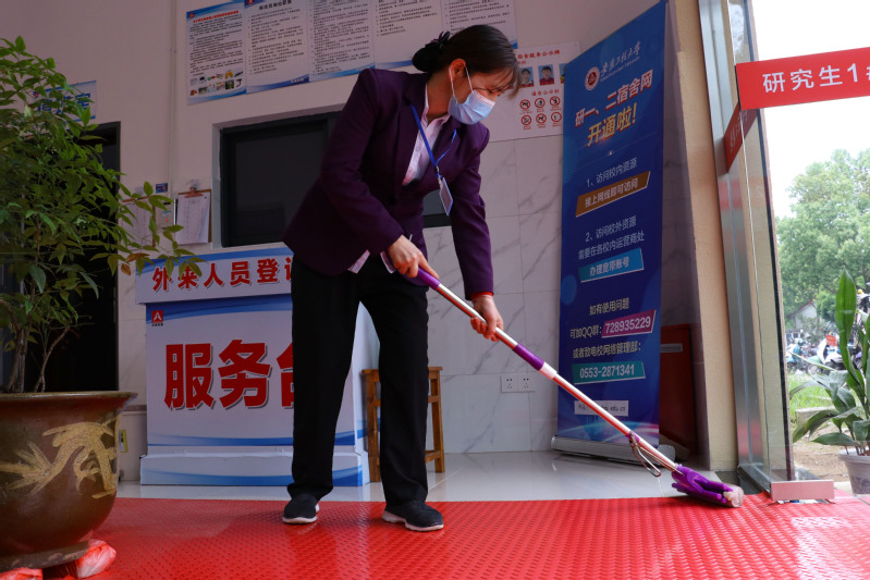 研究生宿管阿姨陶月梅说:“保持宿舍的干净整洁在这个特殊时期格外重要,每个宿管阿姨都会定期对环境消杀,我们要做好同学们的后勤保障工作,让她们没有后顾之忧,在校园里安心生活、快乐地生活!