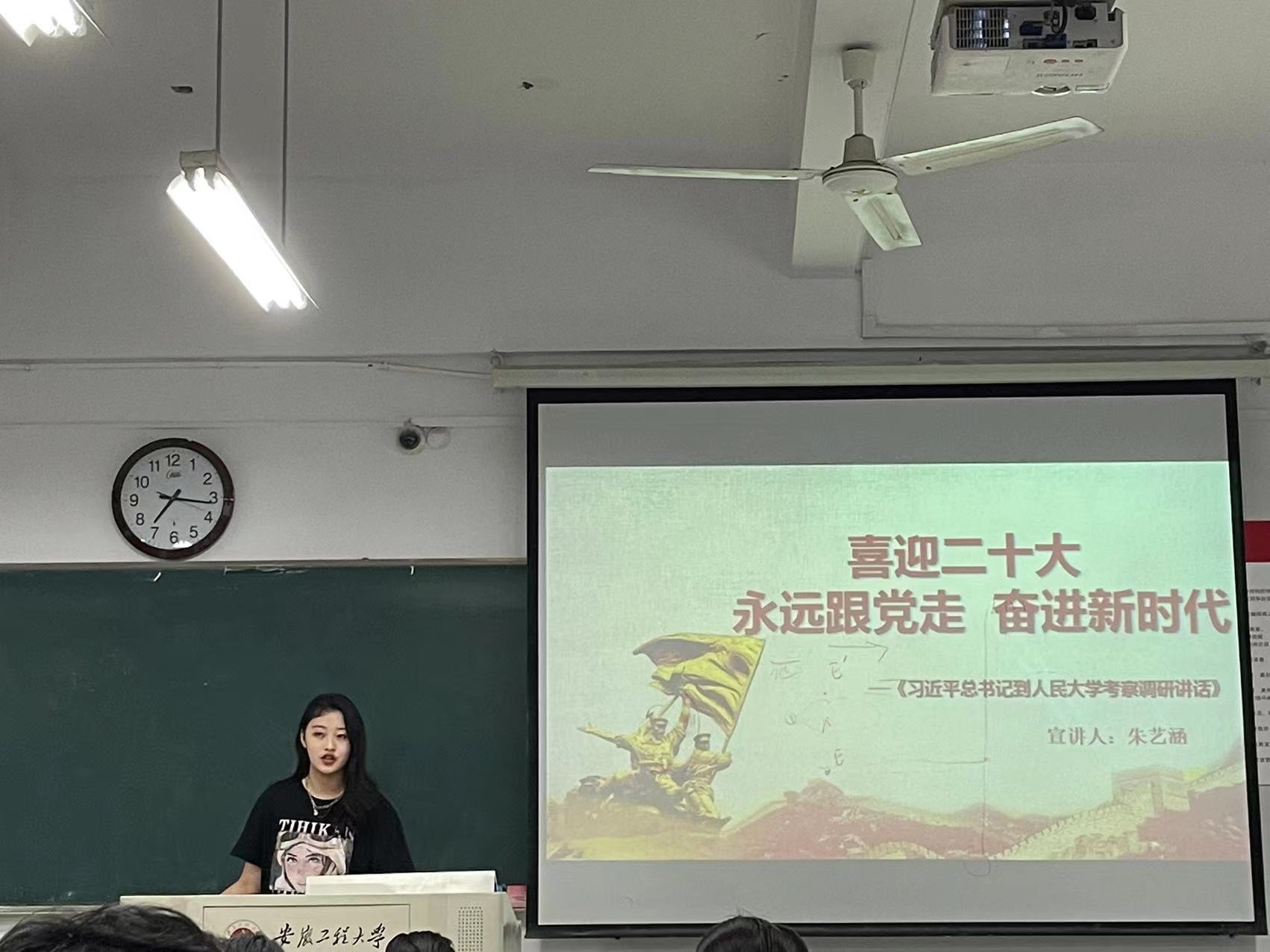 “我们有时间,有力量,有燃烧的信念……”,主题团日活动在诗歌朗诵《青春万岁》中拉开序幕,大学生艺术教育中心四位同学饱满深情地歌颂着青春。活动现场宣读了《关于做好安徽工程大学2022年发展团员工作的通知》和2022年新发展团员名单,校团委副书记程安琪带领新发展团员面向团旗庄严宣誓。