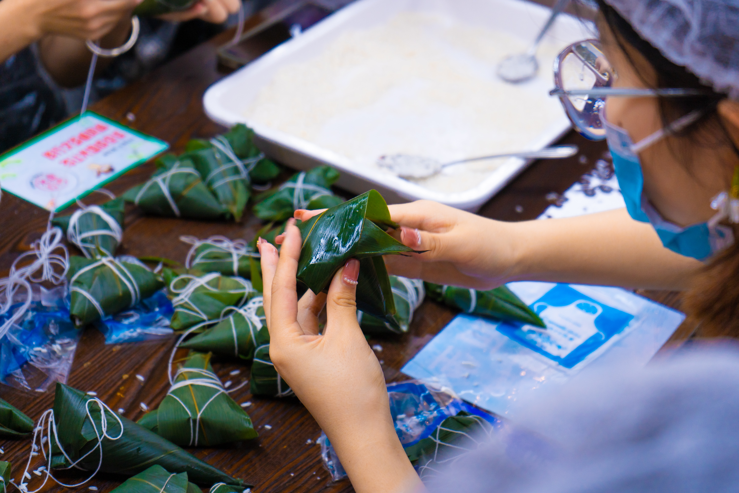 端午节即将来临,校团委联合学校膳食中心,组织同学们开展手工包粽体验活动。糯米的香甜糅合粽叶的清香,大家在淡淡的香味中包裹着手中的粽子。红枣、鲜肉……料足馅多,同学们品尝了自己亲手包的粽子,这是“劳动的美味”。