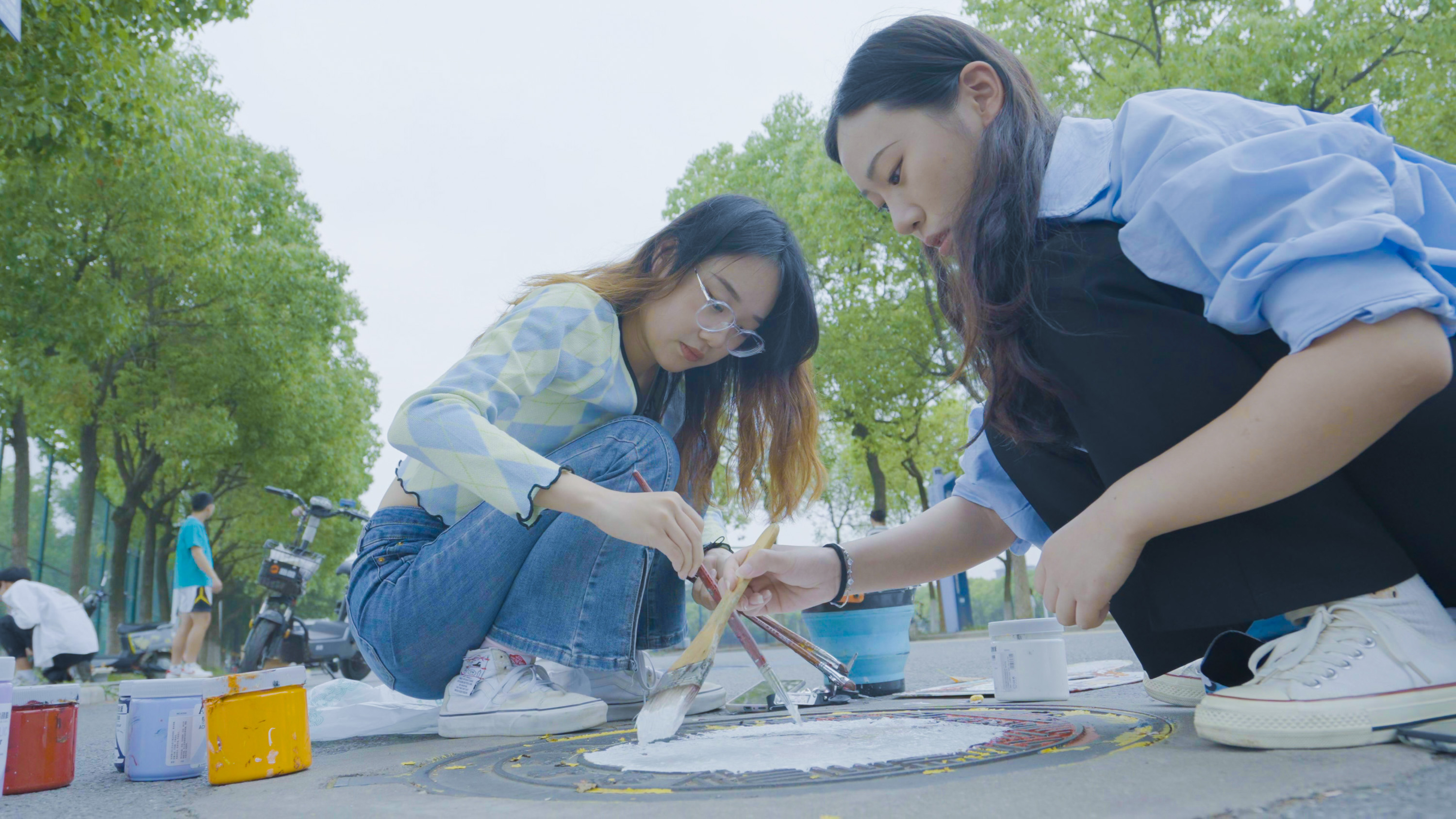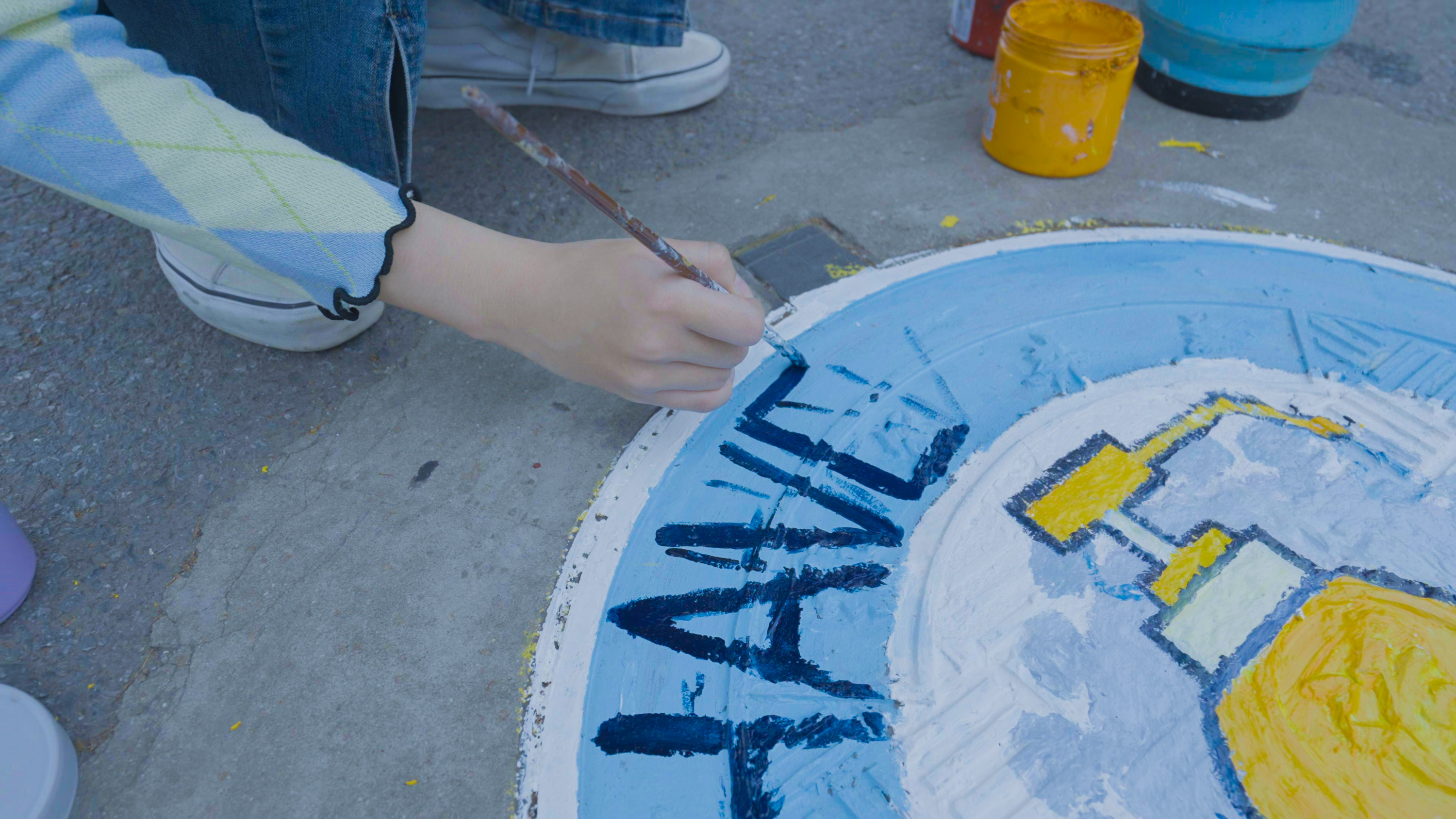 雪容融、冰墩墩来到校园里……最近,很多同学的朋友圈惊现安工程学子与“当代顶流”的拍照留念。这是学校艺术学院的同学们开展的校园井盖美化行动。一支画笔,一叠颜料,艺术学院同学们专心致志地蹲在马路上,在井盖上绘画涂鸦,他们将井盖当作画板,把黑猫警长、海绵宝宝等艺术形象,描摹到路边井盖上,把原本黑黝黝的井盖变成了校园中五彩斑斓的靓丽风景。