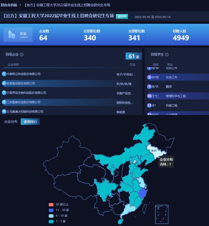 本次招聘会共有64家省内外用人单位线上进行招聘,涉及到30余个行业,提供341个就业岗位。会前,学校运用新媒体平台提前宣传,为广大学子提供了线上招聘会操作指南以及参会入口。2022届研究生毕业生广泛参与招聘,与各用人单位深入沟通、相互了解,部分毕业生达成就业意向。于此同时,研一、研二的学生也积极参会了解就业行情、提前谋划,寻找实习机会。