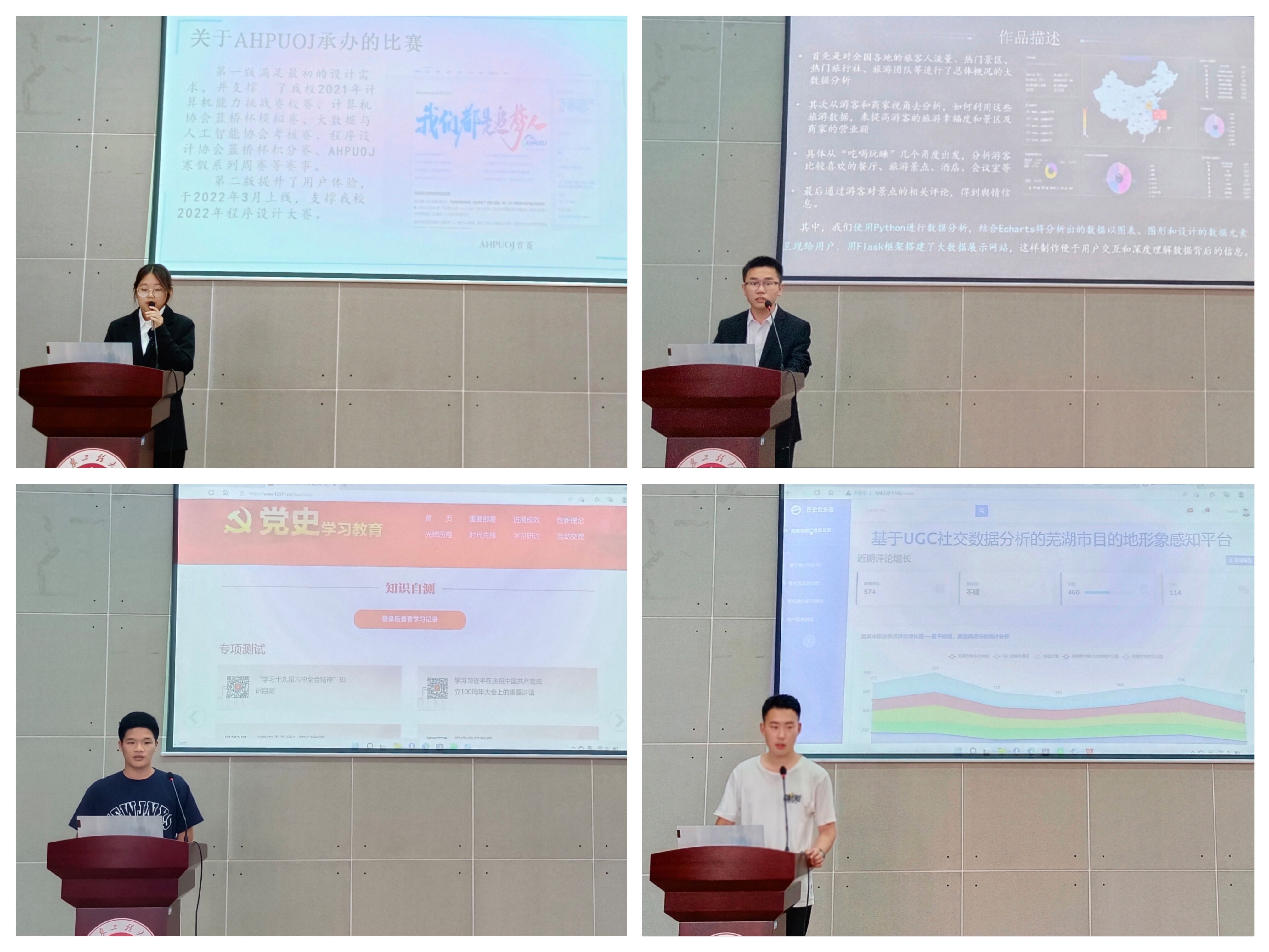 本次大赛采用选手现场展示、问答的形式进行,共11支决赛队伍,70余人现场参与了大赛。计算机与信息学院党委副书记孙德茹,高级工程师汪千松,现代技术中心网络管理员余建强,计算机与信息学院专业教师杨丹、徐晓峰担任本次大赛评委。本次大赛分为初赛和决赛两轮。在初赛各学院提交作品的基础上,根据专业评委的评分、筛选,共有11支队伍进入决赛。参赛作品中,有以党史学习教育为主题的学习型网页;有以推荐阅读书籍为介绍的网页;有以传播汉字的魅力制作出的娱乐型网页;还有以专业知识学习为重点,向大家展示出社团风采的竞赛型网页;更有通过发挥专业能力,用技术为日常生活带来便捷的旅游介绍型网页。作品构成充分实现了网页设计大赛多元化主题要求。决赛环节中,各参赛团队以PPT答辩结合网页作品演示的形式进行展示,选手依次结合设计理念展示团队作品,从设计想法构思、设计理念呈现、设计意义展示、作品功能实现。评委们从网站页面的美观性和实用性等方面对每个作品展开提问。