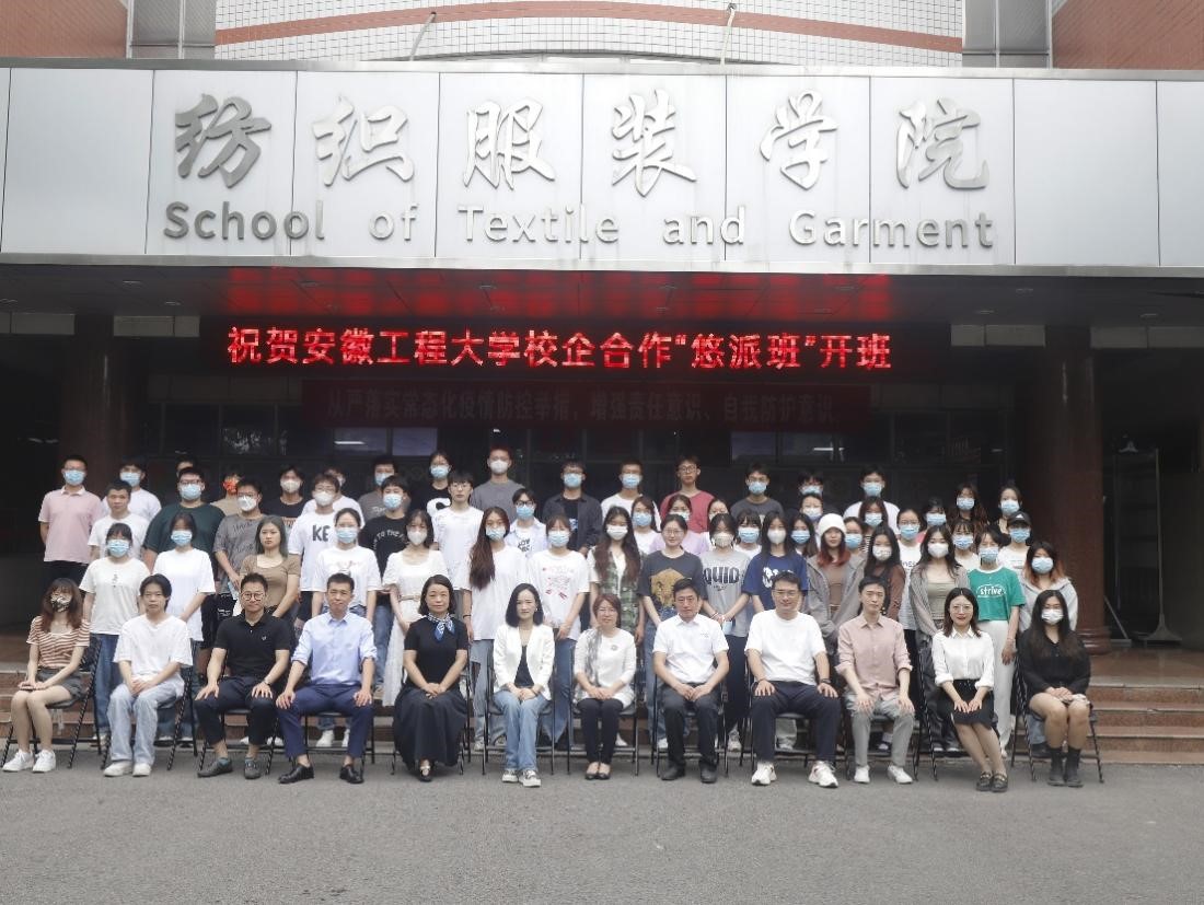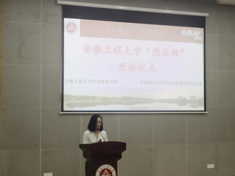 本网讯 5月28日,我校校企合作冠名班“悠派班”开班仪式在C座学术报告厅举行。芜湖悠派护理用品科技有限公司副总经理谢吉、副总经理程胜、副总经理兼Unifree事业部CEO董卡龙、PetCare事业部CEO吴帆,纺织服装学院副院长袁惠芬、副院长徐珍珍,悠派班责任教师和62名同学参加本次开班仪式。