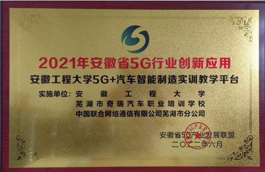 本网讯 6月10日下午,安徽省5G产业发展联盟授予我校“5G+汽车智能制造实训教学平台” 项目2021年安徽省5G行业创新应用奖。