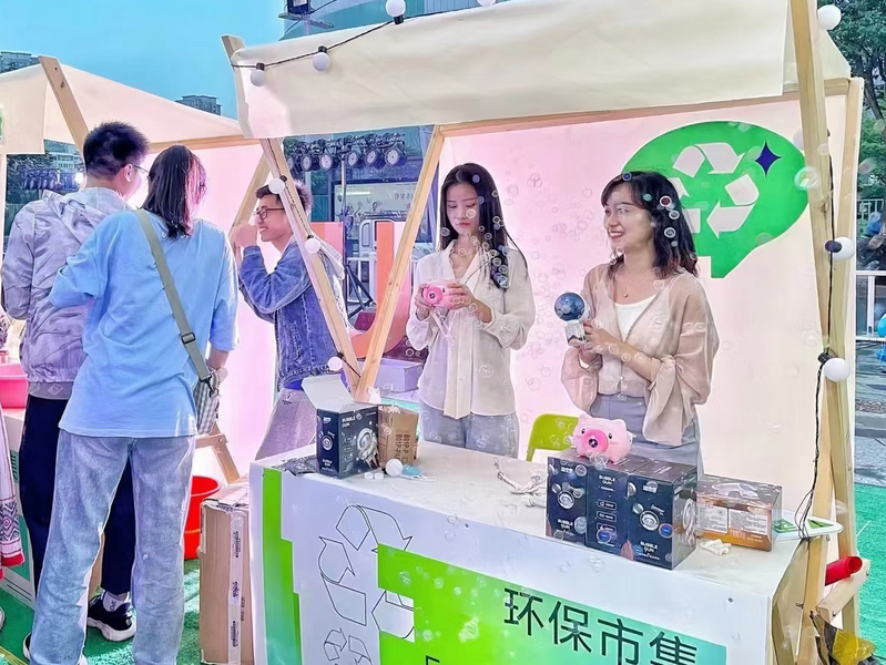 活动现场共设置了垃圾分类、实验室小产物、变废为宝、环保手工艺品、精酿啤酒、手绘T恤、荔枝花坊等18个摊位,创新创业、学科专业、环境保护等元素寓于其中,既是一场创新创业活动,也是一次环保理念宣传、特色专业展示活动,吸引了众多的市民、学生参与。集市现场人头攒动,来自我校不同专业的“小摊主们”各显本领,利用所学专业知识宣讲、展示、售卖。其中,化学与环境工程学院带来的科学小实验《消失的水》《水中沙》《火焰掌》《小桔灯》《火山爆发》吸引大量人员参加,纺织服装学院精致的手工作品《绣“话”》引来众多人员围观。手工艺品、变废为宝、泡泡机等小摊位也完成了可观的现场销售业绩。