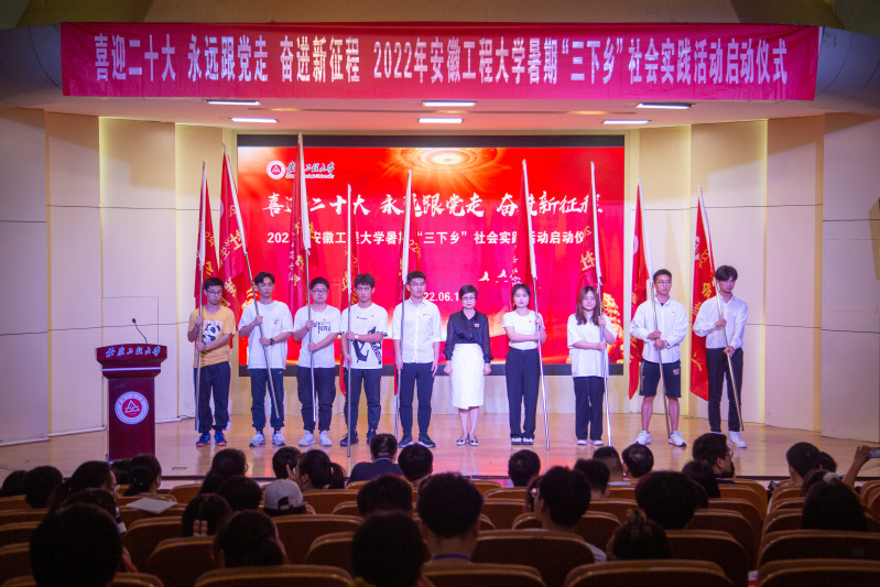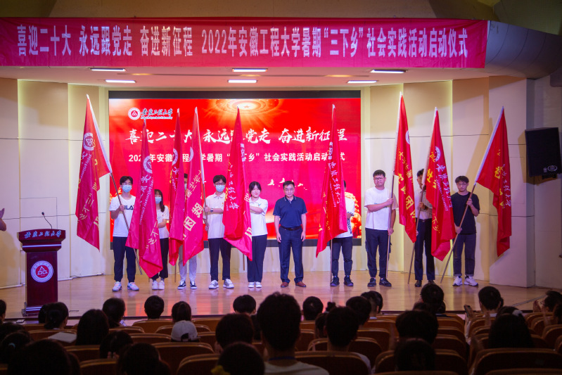 本网讯 6月15日,学校2022年暑期“三下乡”社会实践活动启动仪式在校学术报告厅隆重举行。校党委副书记苏国红,校党委常委、副校长郑健出席仪式并为“三下乡”社会实践重点团队授旗。组织部、宣传部、教务处、学生处、研究生部、校团委、马克思主义学院等主办单位负责人,各学院团委负责人,“三下乡”社会实践重点团队代表,第十一期“青马工程”大学生骨干培训班学员参加仪式。