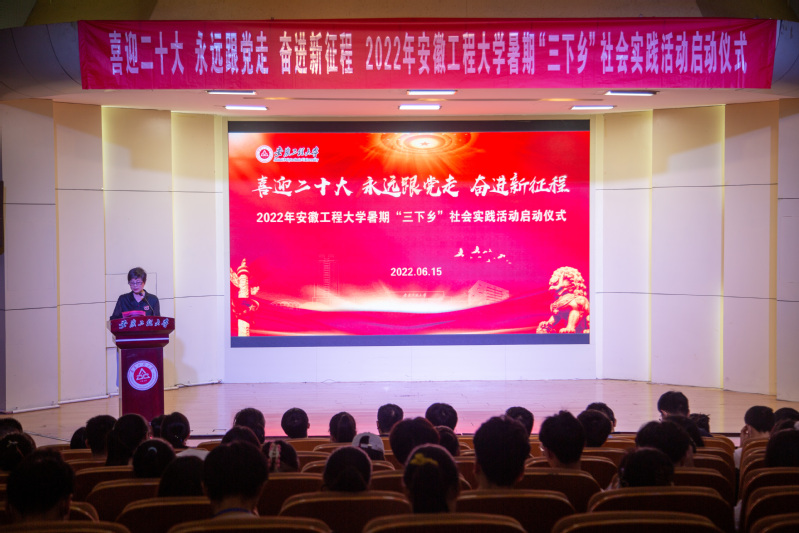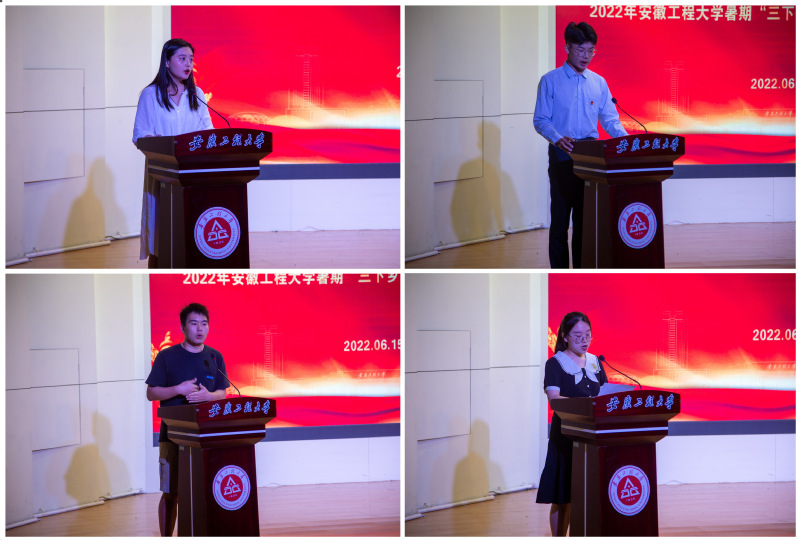 校团委副书记程安琪宣读了《2022年安徽工程大学暑期社会实践活动注意事项》。校团委副书记周宇航做2022年暑期“三下乡”社会实践活动培训。实践团队队员代表、材控203班王昊哲作表态发言。2021年安徽省暑期“三下乡”社会实践优秀活动团队成员、工商201班吴梦分享经验。