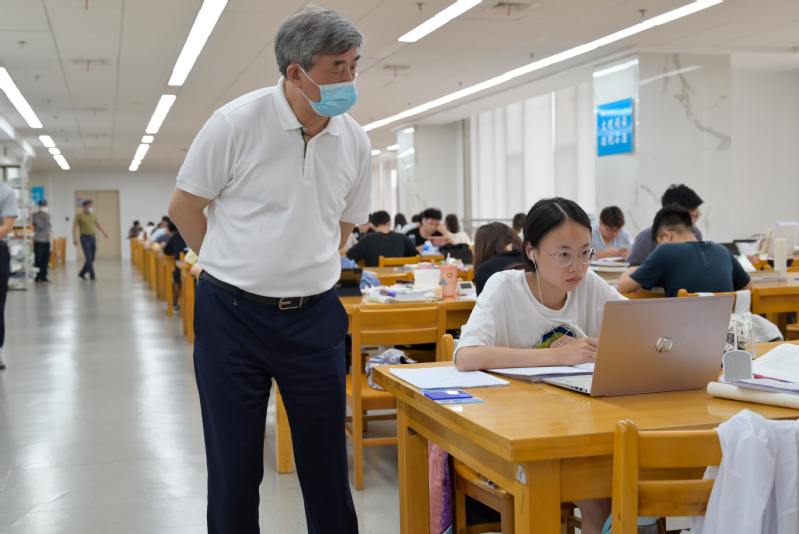 在图书综合楼学习中心,校领导与考研备战学生亲切交流,嘱咐大家认真备考,遵守疫情防控要求,减少非必要外出,做好个人防护,合理安排好假期生活。