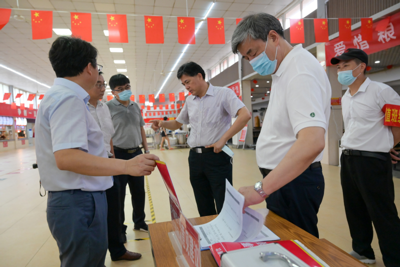 在即将拆除的一食堂附近,校领导仔细查看了地下管网移位施工情况,叮嘱工人师傅“既要保工期,更要保安全”。在二食堂详细了解了暑期菜品供应情况,要求后勤保障部门密切关注每一个食品卫生安全环节,稳价保供,加强检查,为留校师生提供丰富菜品和良好的就餐环境。