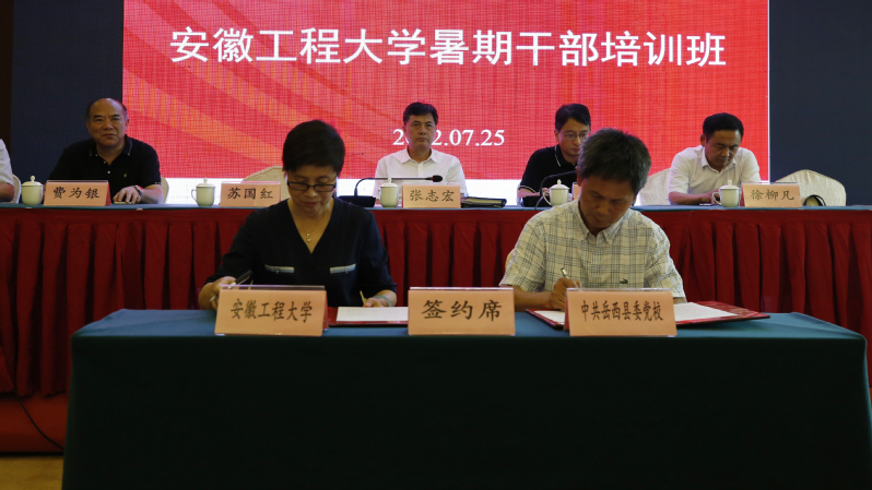苏国红与徐少宏分别代表中共安徽工程大学委员会党校与岳西县委党校签订党建共建协议和干部教育培训基地协议,苏国红与许洪斌共同为安徽工程大学干部教育培训基地揭牌。