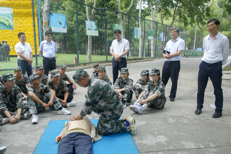 张志宏一行听取了学生处关于军训开展情况的介绍,与参训学生进行了亲切交流,并慰问了因身体不适办理免训的学生。张志宏向同学们讲解军训的意义,鼓励同学们磨练意志、增强体质,做一个有理想、有目标、有担当、有作为的新时代大学生,希望教官严格要求,认真带训,将军训中养成的好传统、好思想、好作风继续保持下去,把军训成果固化到今后的学习、生活、实践中。王绍武对承担军训任务的教官和参与指导保障服务的工作人员的辛勤付出表示赞赏,对参训学生不畏艰苦的训练热情和斗志昂扬的精神风貌给予高度赞扬。他叮嘱新生辅导员、带训教官要科学带训,实时关注新生的军训、生活、健康状况,特别是做好对免训学生的关心关爱,勉励他们利用好这段时间提前感受专业知识,多读书,勤学习。郑健勉励同学们继承发扬不怕苦、不怕累的作风,高质量完成训练任务,要求相关负责部门科学施训,密切关注参训师生的身心健康,做好服务保障,确保顺利完成军训任务。
