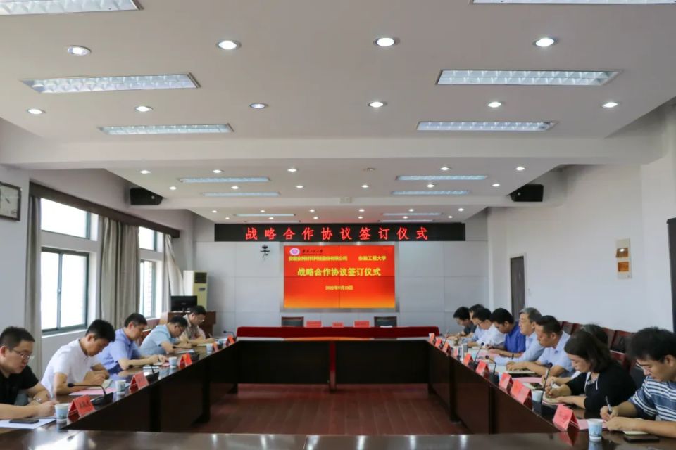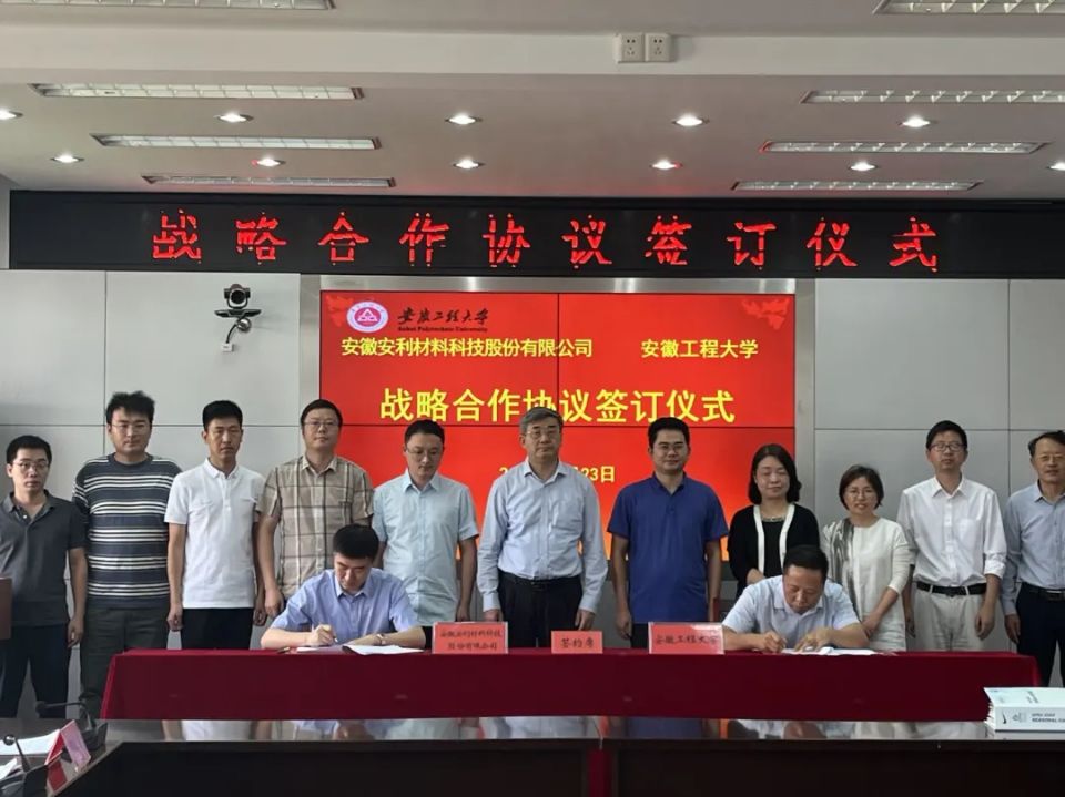 本网讯 9月23日,安徽安利材料科技股份有限公司与我校纺织服装学院校企战略合作协议签字仪式在A座1121会议室举行,校党委副书记、校长王绍武,安徽安利材料科技股份有限公司副总经理黄万里出席,校科技处、安徽安利股份有限公司的相关部门负责人,纺织服装学院教师代表参加了签约仪式。