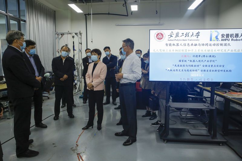 调研过程中,王翠凤参观了学校“学习宣传贯彻党的二十大精神及党建发展情况展”,汽车电子实验室、车辆创新实验室、云制造实验室、虚拟仿真实验室、人工智能实验室、机器人产业技术研究院、国家级机器人现代产业学院等教学科研平台,重点听取了学校历史沿革与总体概况、学习宣传贯彻党的二十大精神、疫情防控、改革发展、学科建设、人才培养、科学研究、社会合作、博士立项单位建设情况汇报。