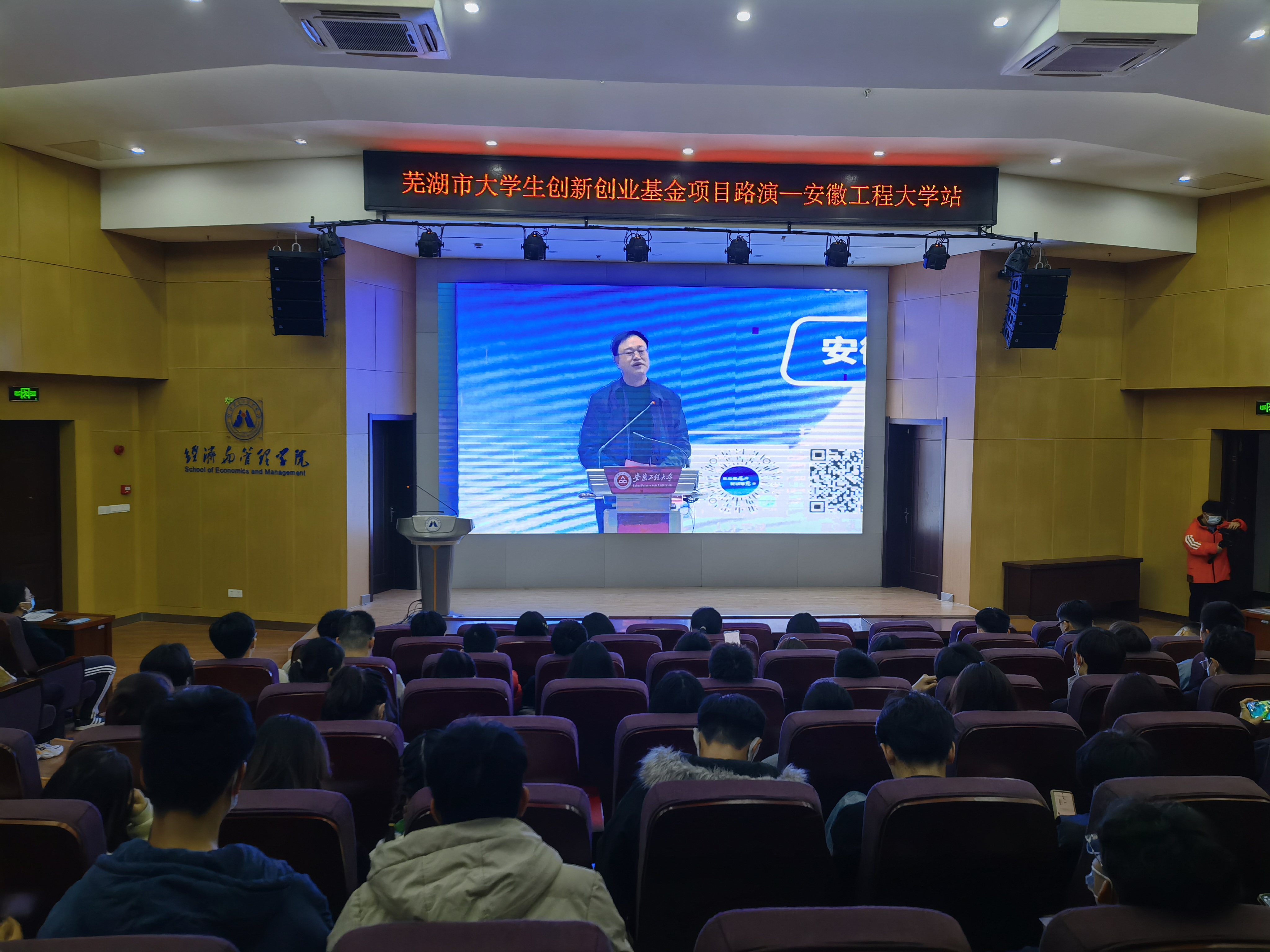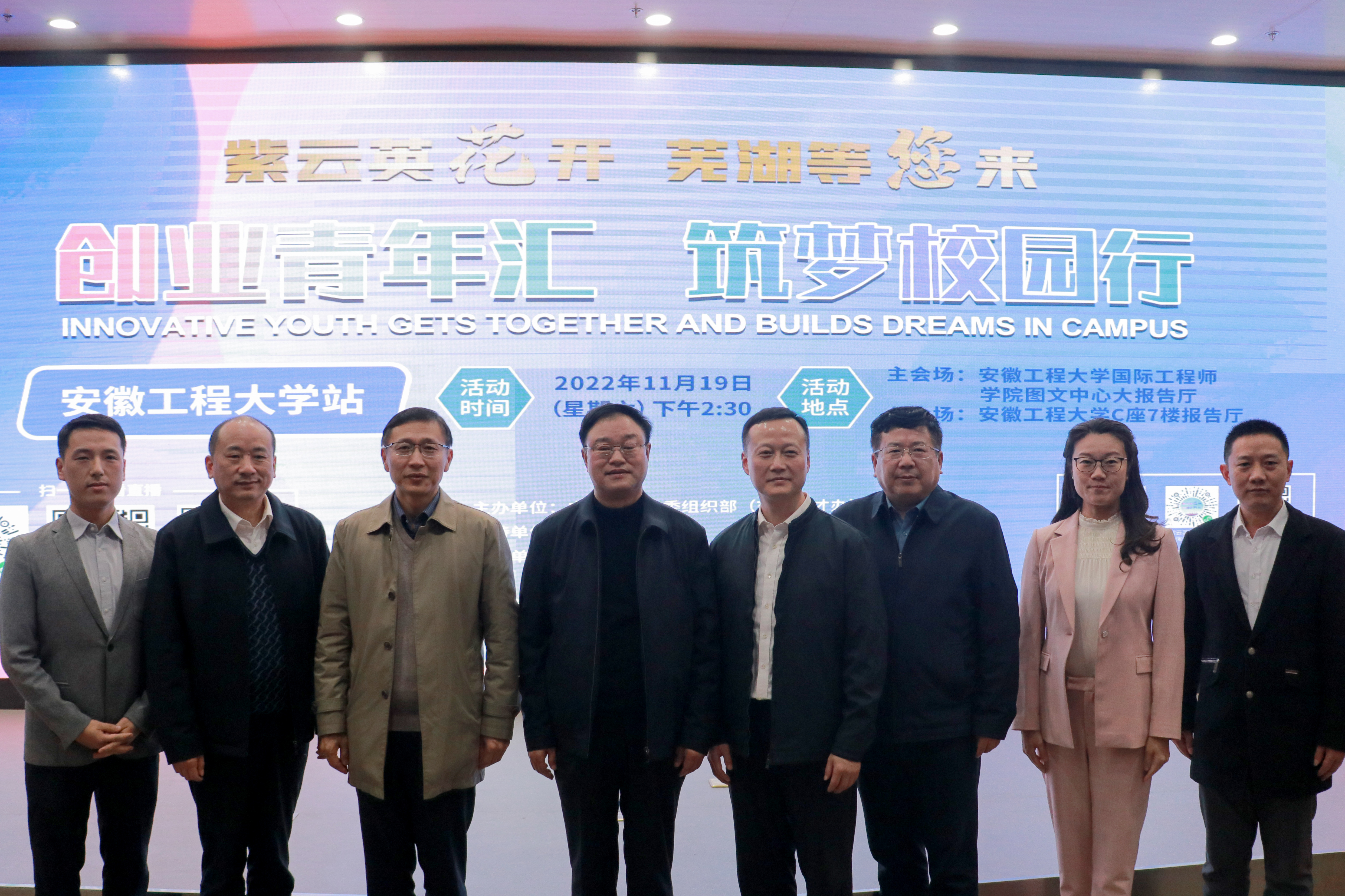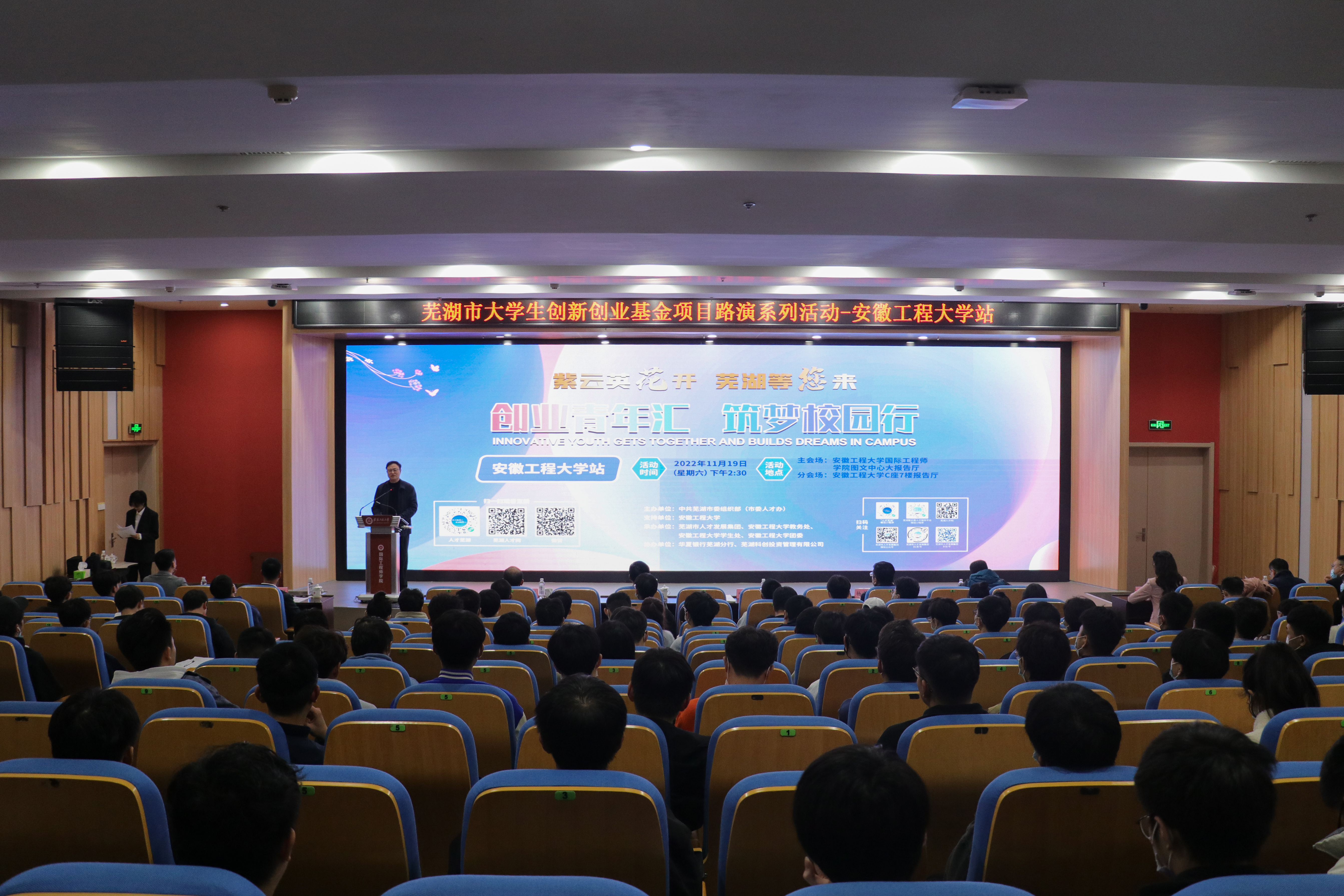 本网讯 11月19日,芜湖市“创业青年汇 筑梦校园行”活动在我校举办。主会场设在我校国际工程师学院图文中心大报告厅,分会场设在本部C座7楼报告厅,我校副校长叶常林、中共芜湖市委组织部(市委人才办)副部长刘天魁出席活动并致辞。活动通过芜湖人才网、人才芜湖、微赞等多个平台同步直播。