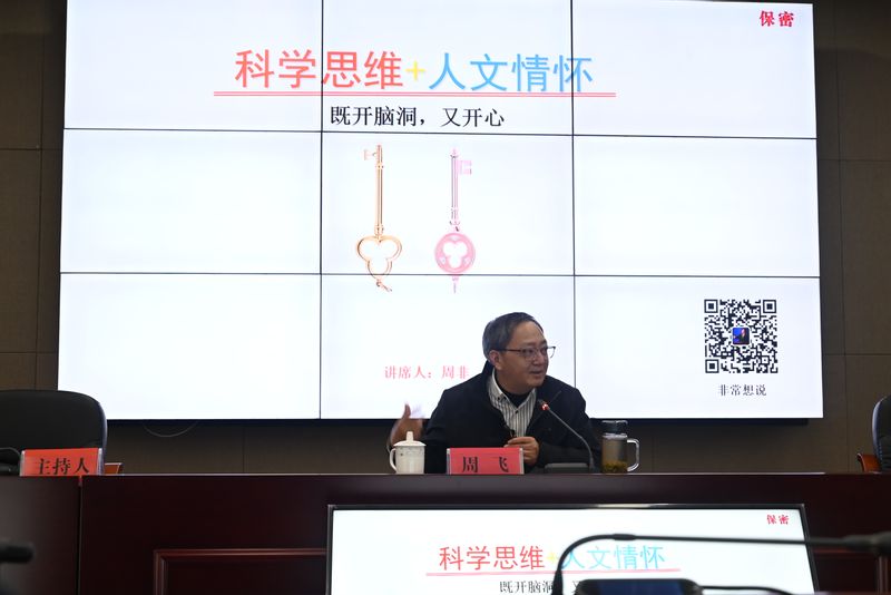 周飞从通才与通识的区别与联系切入,围绕倡导通识、科学思维、人文情怀、月亮智慧、思想维度五个方面,以生动诙谐的语言、 科学严谨的论据阐释了科学思维与人文素养的内在关系。整个报告 汇通古今、贯通中西、融通文理,倡导各位学员既能用科学思维去解读历史文化、开拓新境界,又要以人文情怀对待科学技术、创造新文化。