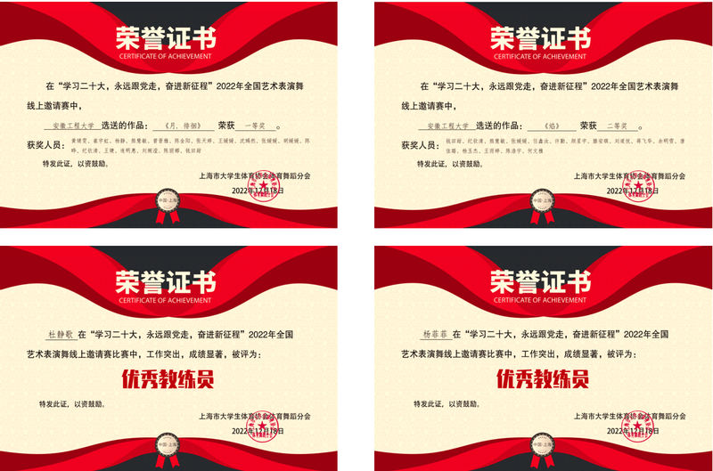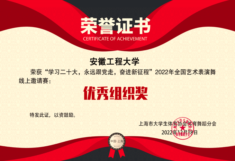 本网讯 12月20日,由上海市大学生体育协会体育舞蹈分会主办,我校承办的“学习二十大 永远跟党走 奋进新征程”2022年全国艺术表演舞线上邀请赛闭幕。我校选送的中国舞作品《月·徘徊》荣获高校中国舞组一等奖(排名第一);街舞作品《焰》荣获高校街舞组二等奖,杜静歌、杨菲菲两位老师获得“优秀教练员”荣誉称号,学校荣获比赛“优秀组织奖”。