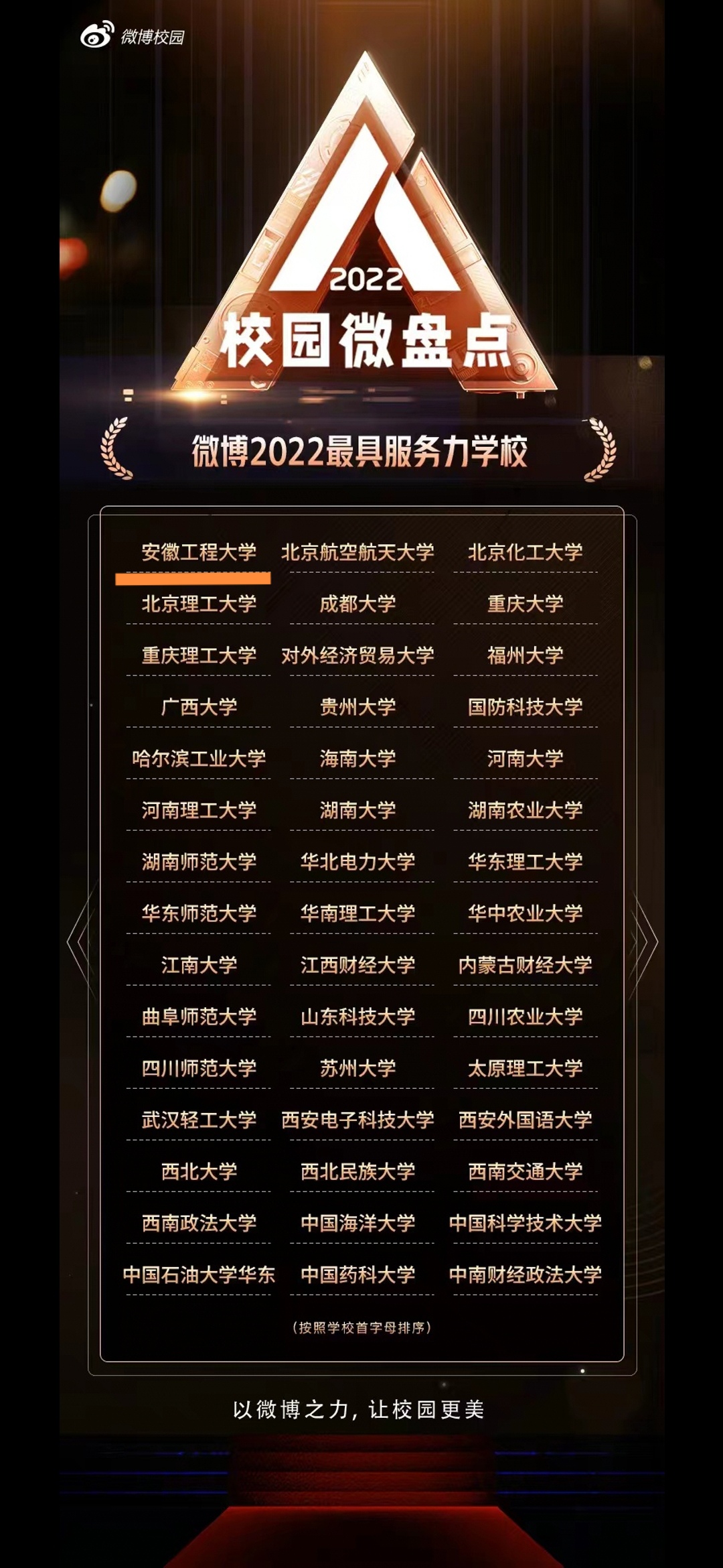 官方微博作为校园官方新媒体平台之一,始终坚持正确的政治方向、舆论导向和价值取向,以较强的新闻时效性与贴近师生的语言积极关注师生网络话题,正面回应师生关切,努力走好网上群众路线,积极营造网络良好生态。学校87周年校庆日当天,学校官方微博发起话题#安徽工程大学87周年校庆#,阅读量达44.7万。