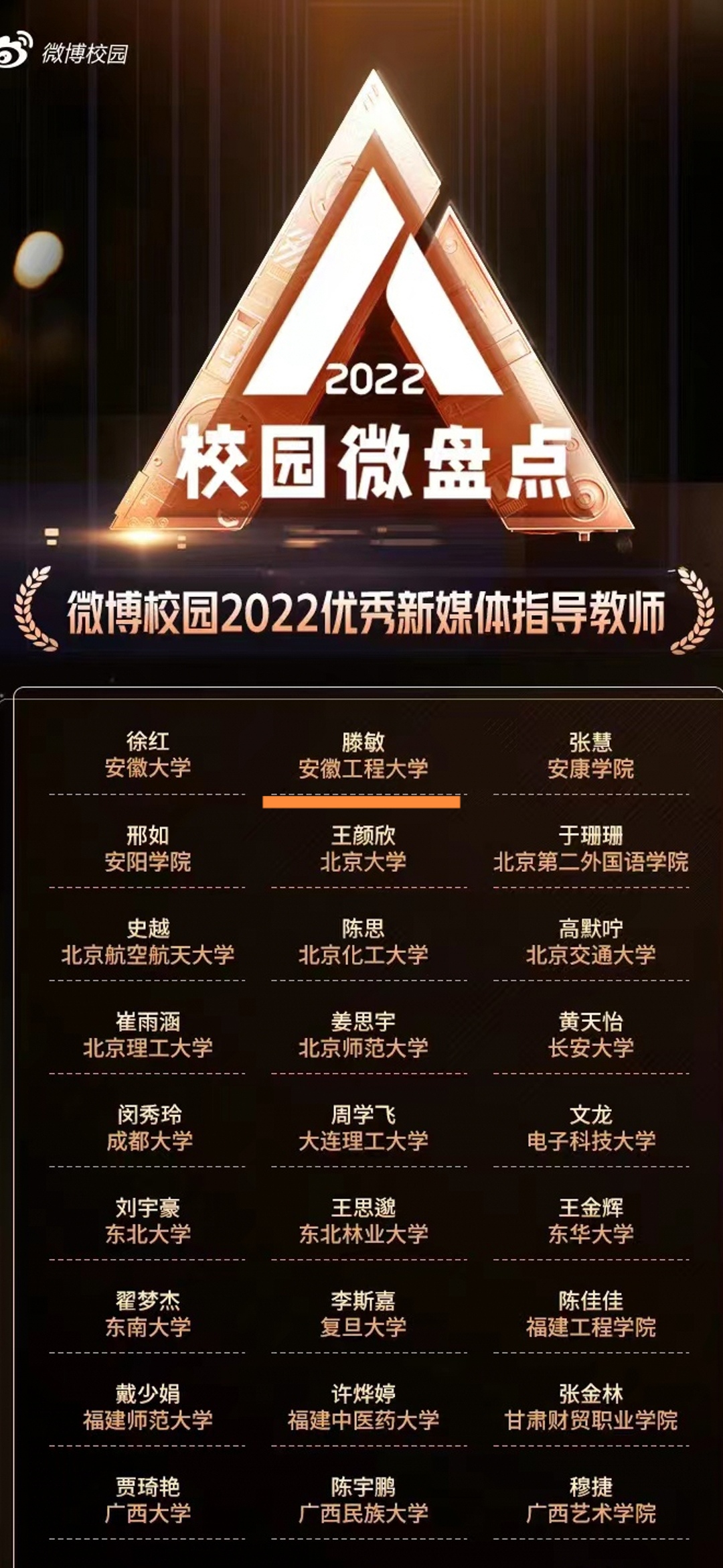 本网讯 1月11日,新浪微博微盘点荣誉榜单公布,我校获“2022微博校园最具服务力学校”称号,官方微博指导教师滕敏获“2022年微博校园优秀新媒体指导教师”称号。这是学校继荣获教育部中国大学生在线2022年度校园新媒体融合共建三十强之后,再次荣获的新媒体建设奖项。学校已连续两年获得此项表彰。