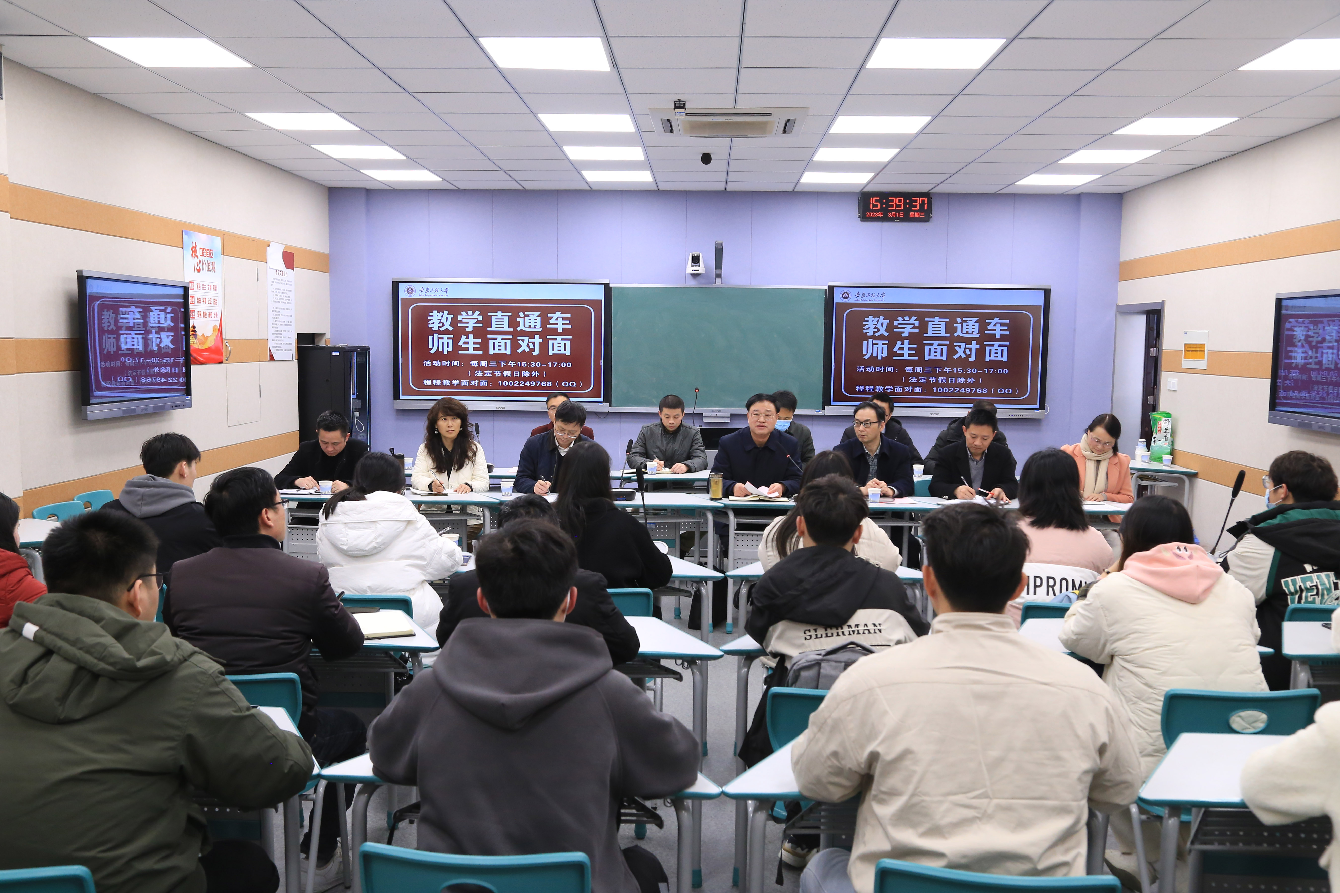 本网讯 3月1日,学校采用线上线下相结合方式举行“教学直通车-师生面对面”活动,分别于校本部4教101智慧教室和国际工程师学院图书馆一楼同时启动,“程程教学面对面”QQ号线上同步沟通。教务处负责人、学院负责人、学院师生代表及教务处相关人员参加交流活动。活动由副校长叶常林主持。