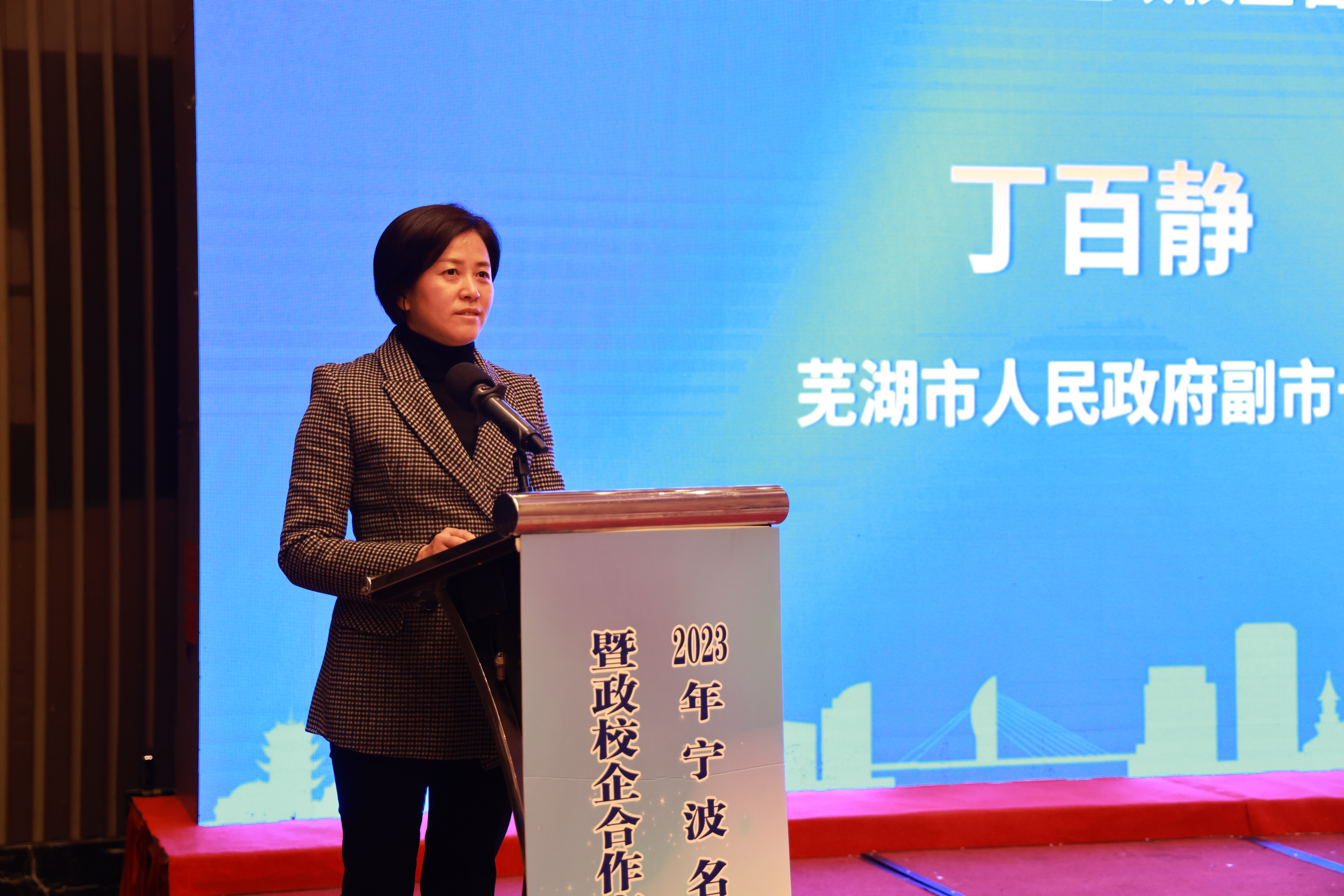 在市、校、企合作对接活动阶段,芜湖市人民政府副市长丁百静代表芜湖市委、市政府致辞。她在致辞中指出,芜湖市产业特色鲜明、门类齐全、体系完整,区位优势、交通优势、产业优势、生态优势突出,与安徽工程大学的合作取得了丰硕成果;芜湖作为拥江发展的安徽省域副中心、经济第二大市,希望以此次为契机,企业家们可以进一步了解芜湖、爱上芜湖、投资芜湖,欢迎来芜深化互动合作,实现共赢发展。