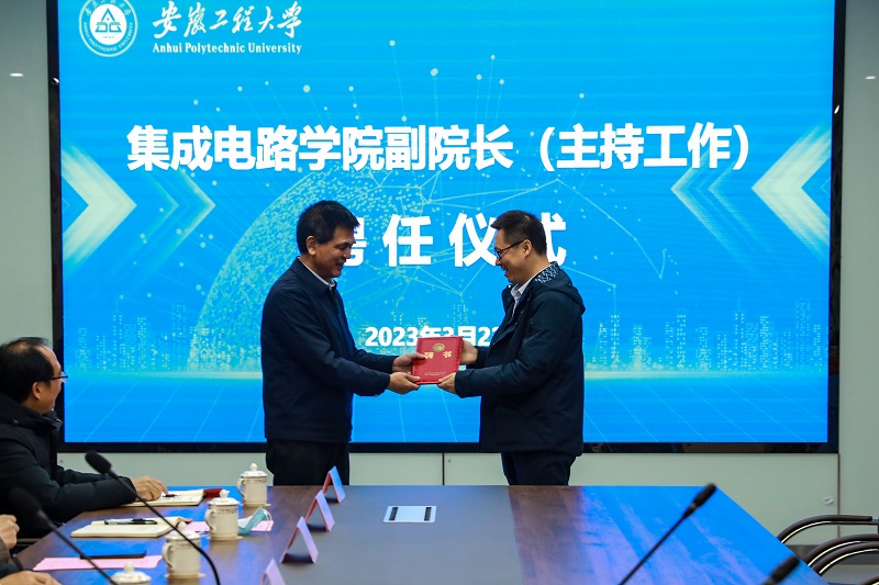 冉昆玉介绍林信南同志的基本情况,王弘宣读聘任文件,卢平代表学校颁发聘书。林信南同志做表态发言。杨会成代表电气工程学院(集成电路学院)领导班子,感谢学校对学院领导班子、发展建设的关心与厚爱,表示将支持林信南同志创造性开展工作,把学院建设好、发展好。