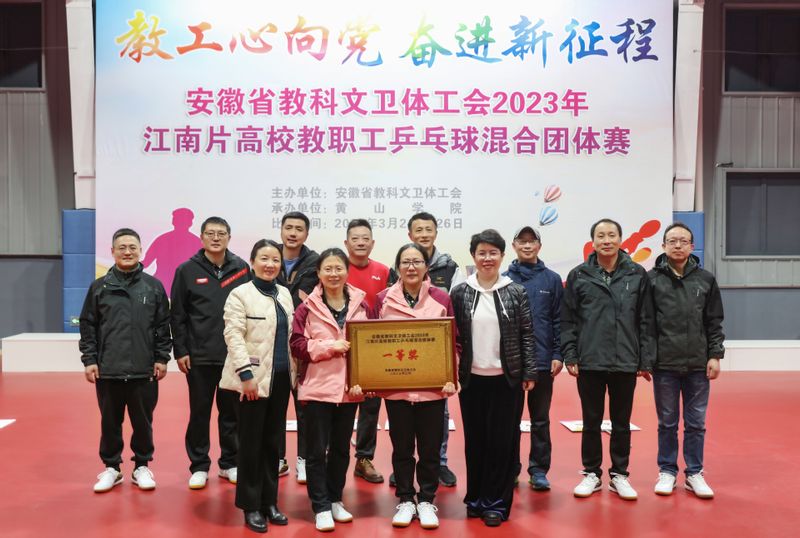 本网讯 3月24日至26日,由安徽省教科文卫体工会主办的2023年江南片高校教职工乒乓球混合团体赛在安徽黄山成功举办。我校组队参赛,夺得一等奖。