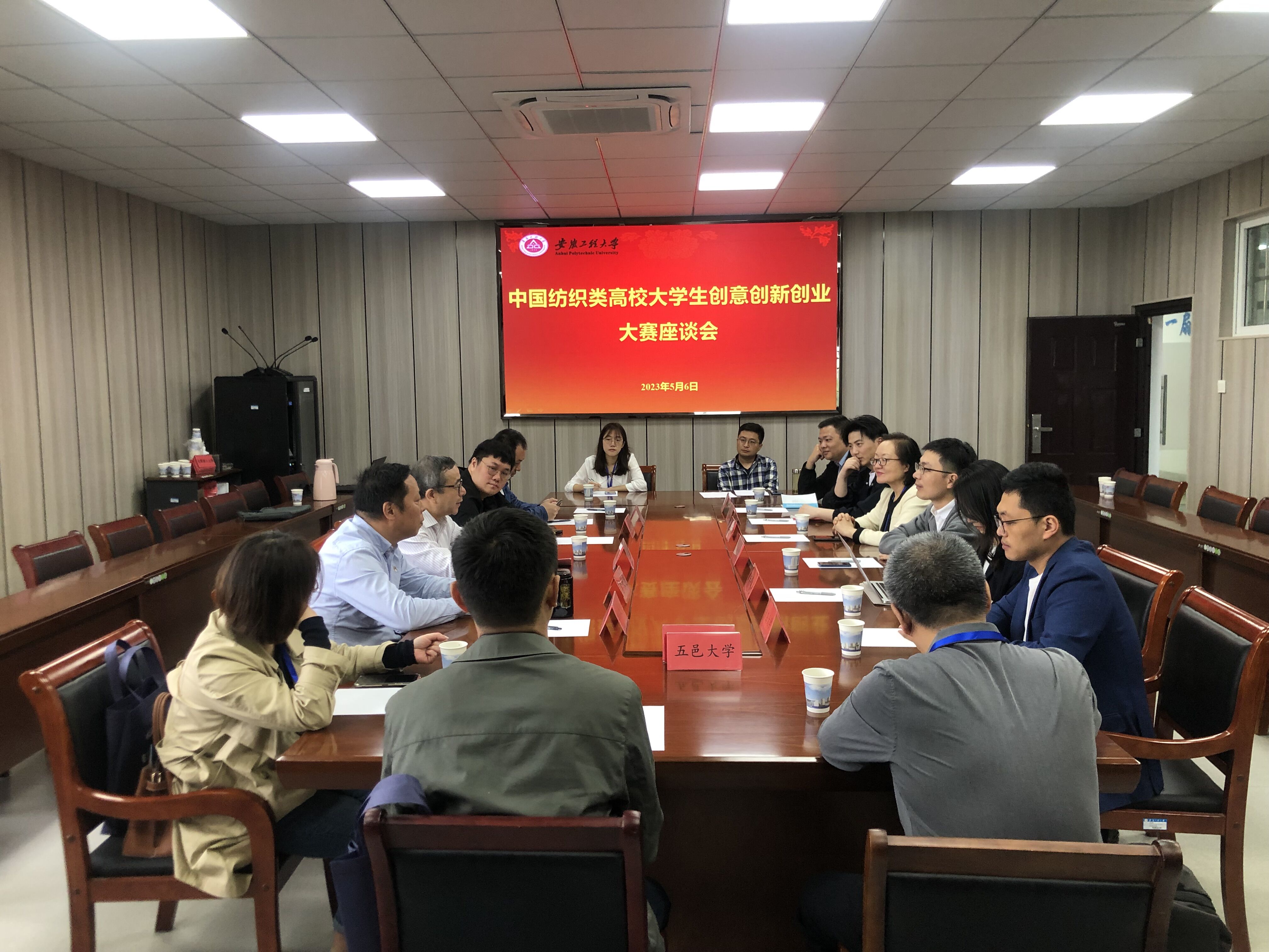 大赛期间,在纺织服装学院会议室召开了纺织服装类大学生三创竞赛座谈会,会议由安徽工程大学纺织服装学院院长李长龙主持。座谈会上,各兄弟院校间围绕创新创业教育,开展深入的交流与合作,进一步促进纺织服装类专业建设发展,拓宽学生参赛路径,为校校、校企合作提供了新的平台。