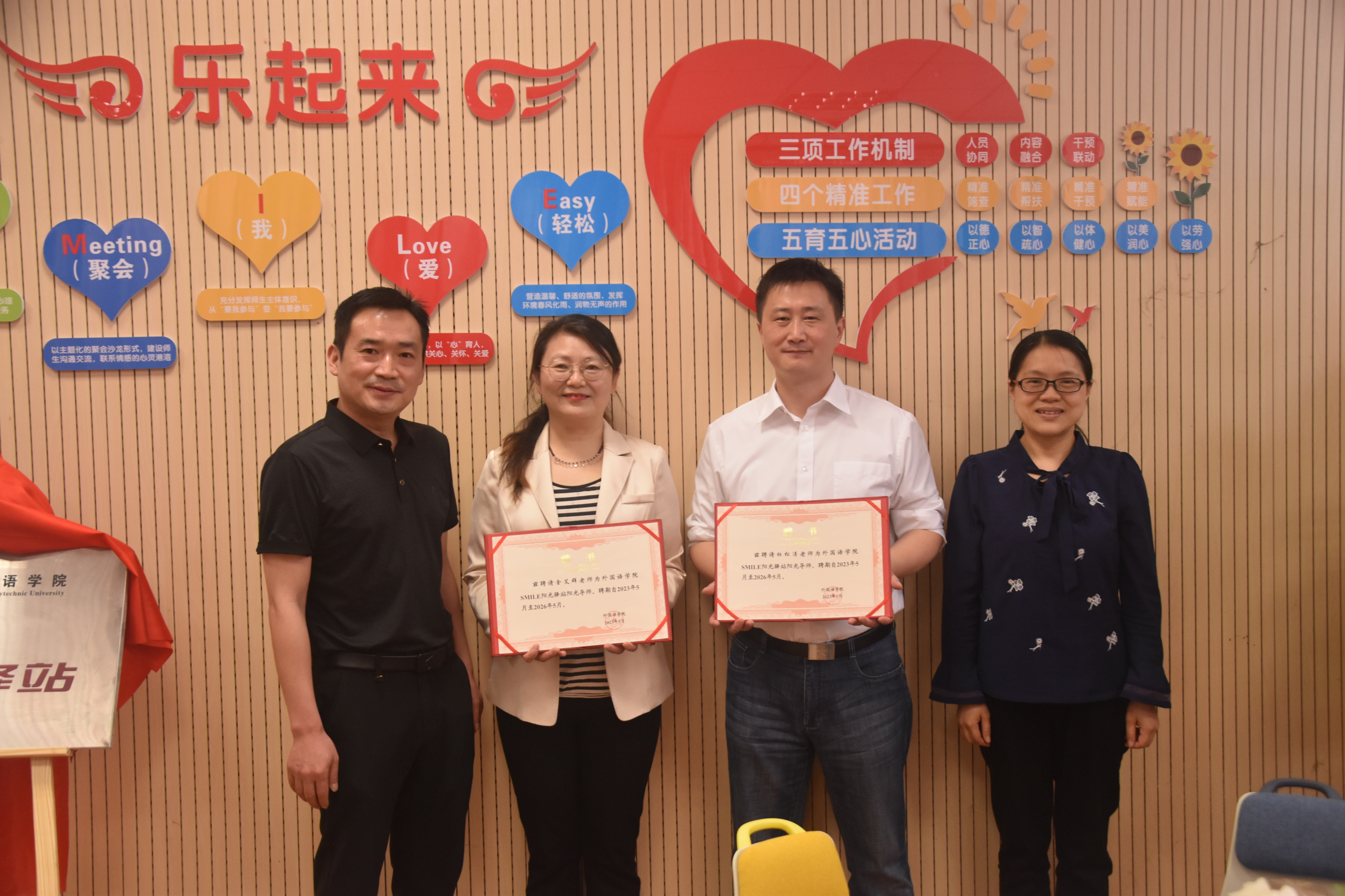 学生处处长黄炜、外国语学院党委书记董金权、心理健康教育中心副主任金艾裙、学生处副处长杜松涛共同为“SMILE阳光驿站”揭牌。董金权分别为金艾裙、杜松涛颁发“SMILE阳光驿站”阳光导师聘书。